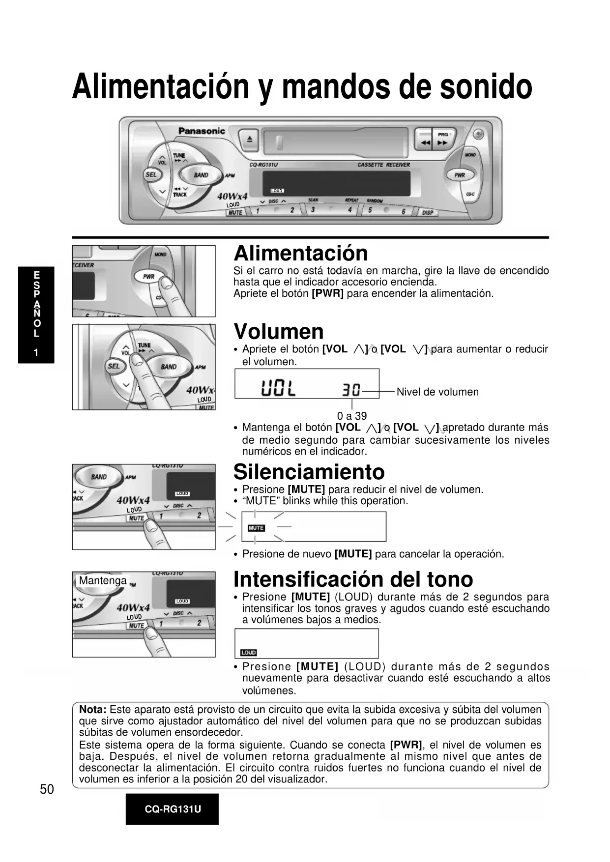 Presione [MUTE] (LOUD) durante más de 2 segundos nuevamente para desactivar cuando esté escuchando a altos volúmenes. Nota: Este aparato está provisto de un circuito que evita la subida excesiva y súbita del volumen que sirve como ajustador automático del nivel del volumen para que no se produzcan subidas súbitas de volumen ensordecedor. Este sistema opera de la forma siguiente. Cuando se conecta [PWR], el nivel de volumen es baja. Después, el nivel de volumen retorna gradualmente al mismo nivel que antes de desconectar la alimentación. El circuito contra ruidos fuertes no funciona cuando el nivel de volumen es inferior a la posición 20 del visualizador. MantengaCQ-RG131U