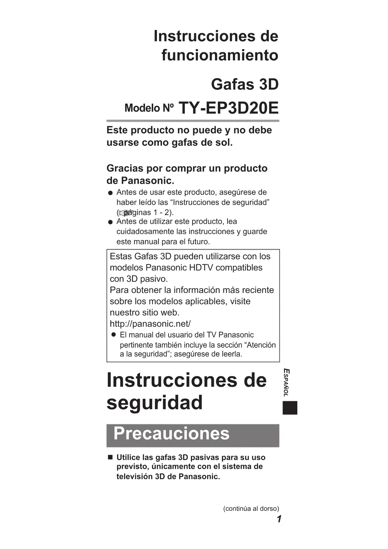 SPAÑOL Instrucciones de funcionamiento Gafas 3D Modelo Nº TY-EP3D20E Este producto no puede y no debe usarse como gafas de sol. Gracias por comprar un producto de Panasonic. Antes de usar este producto, asegúrese de haber leído las “Instrucciones de seguridad” ( páginas 1 - 2).Antes de utilizar este producto, lea cuidadosamente las instrucciones y guarde este manual para el futuro.Estas Gafas 3D pueden utilizarse con los modelos Panasonic HDTV compatibles con 3D pasivo.Para obtener la información más reciente sobre los modelos aplicables, visite nuestro sitio web.http://panasonic.net/El manual del usuario del TV Panasonic pertinente también incluye la sección “Atención a la seguridad”; asegúrese de leerla. Instrucciones de seguridad Precauciones Utilice las gafas 3D pasivas para su uso previsto, únicamente con el sistema de televisión 3D de Panasonic.(continúa al dorso)2