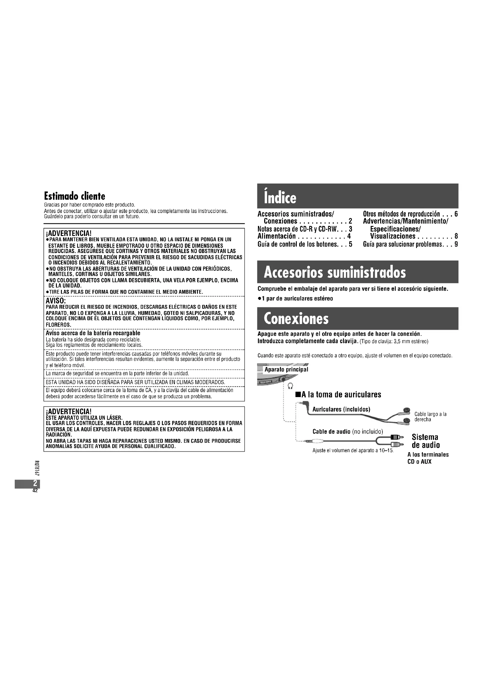 ¡ADVERTENCIA! ≥PARA MANTENER BIEN VENTILADA ESTA UNIDAD, NO LA INSTALE NI PONGA EN UNESTANTE DE LIBROS, MUEBLE EMPOTRADO U OTRO ESPACIO DE DIMENSIONESREDUCIDAS. ASEGÚRESE QUE CORTINAS Y OTROS MATERIALES NO OBSTRUYAN LAS CONDICIONES DE VENTILACIÓN PARA PREVENIR EL RIESGO DE SACUDIDAS ELÉCTRICAS O INCENDIOS DEBIDOS AL RECALENTAMIENTO. ≥NO OBSTRUYA LAS ABERTURAS DE VENTILACIÓN DE LA UNIDAD CON PERIÓDICOS, MANTELES, CORTINAS U OBJETOS SIMILARES.≥NO COLOQUE OBJETOS CON LLAMA DESCUBIERTA, UNA VELA POR EJEMPLO, ENCIMADE LA UNIDAD.≥TIRE LAS PILAS DE FORMA QUE NO CONTAMINE EL MEDIO AMBIENTE. AVISO: PARA REDUCIR EL RIESGO DE INCENDIOS, DESCARGAS ELÉCTRICAS O DAÑOS EN ESTE APARATO, NO LO EXPONGA A LA LLUVIA, HUMEDAD, GOTEO NI SALPICADURAS, Y NO COLOQUE ENCIMA DE ÉL OBJETOS QUE CONTENGAN LÍQUIDOS COMO, POR EJEMPLO, FLOREROS. Aviso acerca de la batería recargable La batería ha sido designada como reciclable.Siga los reglamentos de reciclamiento locales. Este producto puede tener interferencias causadas por teléfonos móviles durante su utilización. Si tales interferencias resultan evidentes, aumente la separación entre el producto y el teléfono móvil.La marca de seguridad se encuentra en la parte inferior de la unidad.ESTA UNIDAD HA SIDO DISEÑADA PARA SER UTILIZADA EN CLIMAS MODERADOS. El equipo deberá colocarse cerca de la toma de CA, y a la clavija del cable de alimentación deberá poder accederse fácilmente en el caso de que se produzca un problema. Estimado cliente Gracias por haber comprado este producto.Antes de conectar, utilizar o ajustar este producto, lea completamente las instrucciones.Guárdelo para poderlo consultar en un futuro. ¡ADVERTENCIA! ESTE APARATO UTILIZA UN LÁSER.EL USAR LOS CONTROLES, HACER LOS REGLAJES O LOS PASOS REQUERIDOS EN FORMA DIVERSA DE LA AQUÍ EXPUESTA PUEDE REDUNDAR EN EXPOSICIÓN PELIGROSA A LA RADIACIÓN.NO ABRA LAS TAPAS NI HAGA REPARACIONES USTED MISMO. EN CASO DE PRODUCIRSEANOMALÍAS SOLICITE AYUDA DE PERSONAL CUALIFICADO. Auriculares (incluidos) Cable largo a laderecha A los terminales CD o AUX Sistema de audio Cable de audio (no incluido) Aparato principal Apague este aparato y el otro equipo antes de hacer la conexión. Introduzca completamente cada clavija. (Tipo de clavija: 3,5 mm estéreo)Cuando este aparato esté conectado a otro equipo, ajuste el volumen en el equipo conectado. ∫A la toma de auriculares Ajuste el volumen del aparato a 10–15. Índice Accesorios suministrados/ Conexiones . . . . . . . . . . . . 2 Notas acerca de CD-R y CD-RW