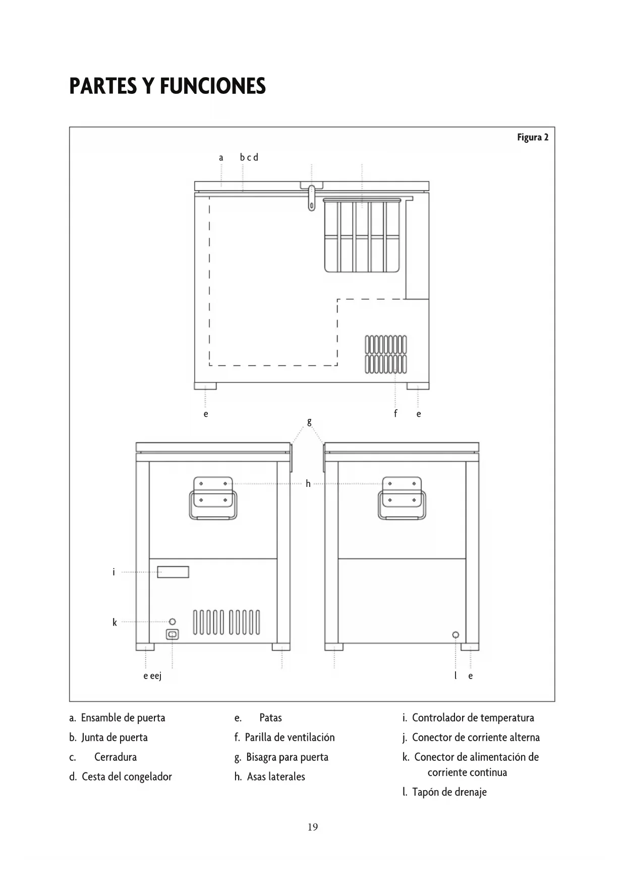 Al mover el congelador, la unidad siempre debe mantenerse tan nivelada y recta como sea posible a fin de proteger el compresor y el sistema de refrigeración. Deje que la unidad repose por al menos 4 horas luego de moverla, antes de enchufarla y ponerla a funcionar. Sitúe el congelador en un área seca y bien ventilada, lejos de la luz solar directa, las fuentes de calor y cualquier gas o material corrosivo. No permita que se moje ni le caiga lluvia a esta unidad. El funcionamiento del congelador depende del calor que sale del gabinete hacia el aire a través del condensador, así que cerciórese de retirar todo el material de empaque y permita al menos 6 pulgadas de espacio libre alrededor de la unidad. Conecte la unidad a un tomacorriente de 120V o un enchufe de 12V/24V adecuadamente instalado y conectado a tierra. El fabricante no se hace responsable por cualquier daño a causa de la conexión a un suministro eléctrico inadecuado. Tras mover la unidad, deje que esta repose por al menos 4 horas para permitir que los líquidos presentes en el sistema de refrigeración se asienten. Hacer caso omiso de esto puede causar que la unidad no enfríe adecuadamente o funcione mal. Siempre mantenga el congelador tan nivelado y recto como sea posible al moverlo. Sitúe el congelador en un área seca, bien ventilada lejos de la luz solar o fuentes de calor, así como de cualquier material corrosivo o vapor. NO lo instale en un lugar donde el congelador pueda mojarse.21