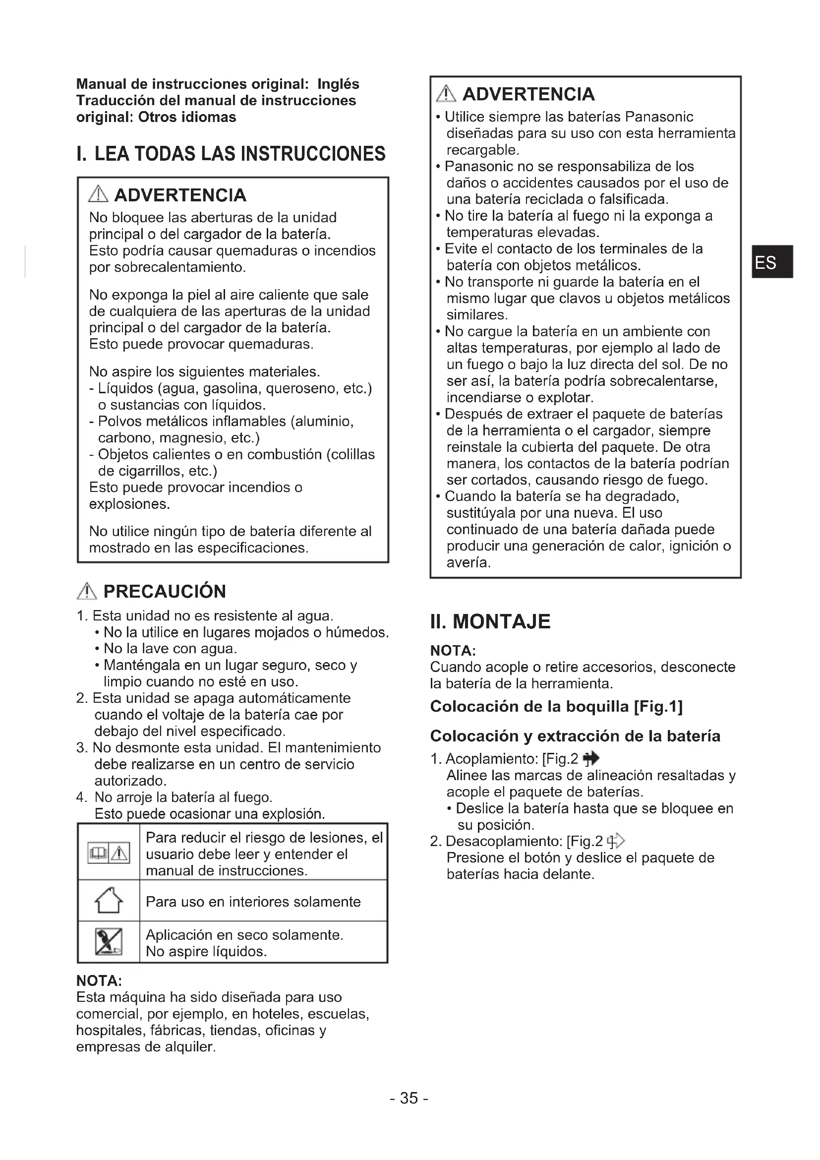 ADVERTENCIA No bloquee las aberturas de la unidad principal o del cargador de la batería. Esto podría causar quemaduras o incendios por sobrecalentamiento. No exponga la piel al aire caliente que sale de cualquiera de las aperturas de la unidad principal o del cargador de la batería. Esto puede provocar quemaduras. No aspire los siguientes materiales. - Líquidos (agua, gasolina, queroseno, etc.) o sustancias con líquidos. - Polvos metálicos inflamables (aluminio, carbono, magnesio, etc.) - Objetos calientes o en combustión (colillas de cigarrillos, etc.) Esto puede provocar incendios o explosiones. No utilice ningún tipo de batería diferente al mostrado en las especificaciones. PRECAUCIÓN