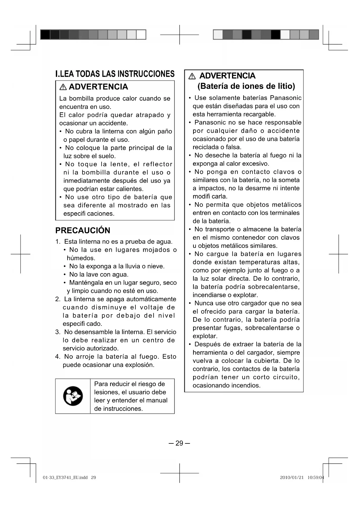 puede ocasionar una explosión. Para reducir el riesgo de lesiones, el usuario debe leer y entender el manual de instrucciones. ADVERTENCIA (Batería de iones de litio)