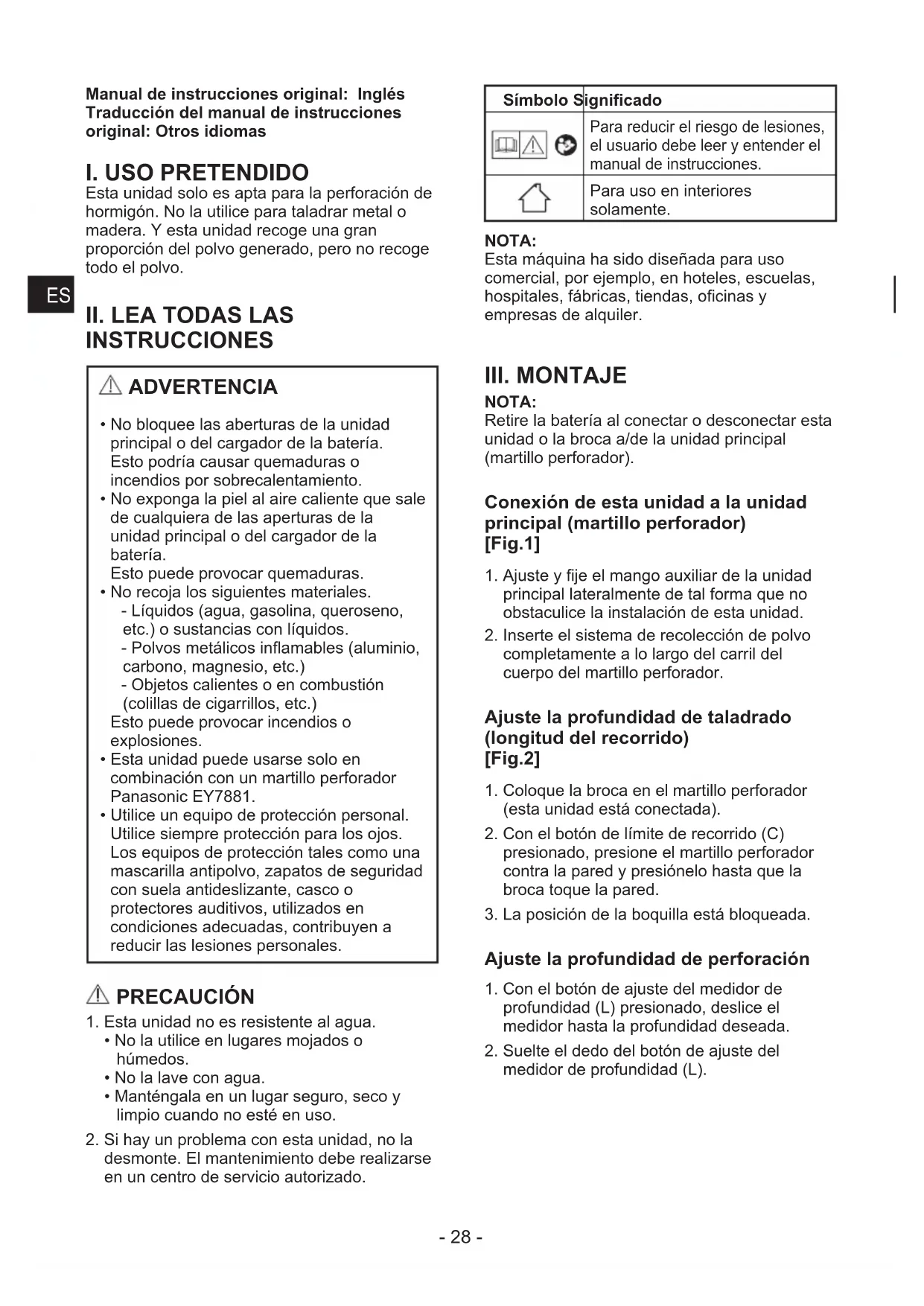 - Esta unidad puede usarse solo en combinación con un martillo perforador Panasonic EY7881.