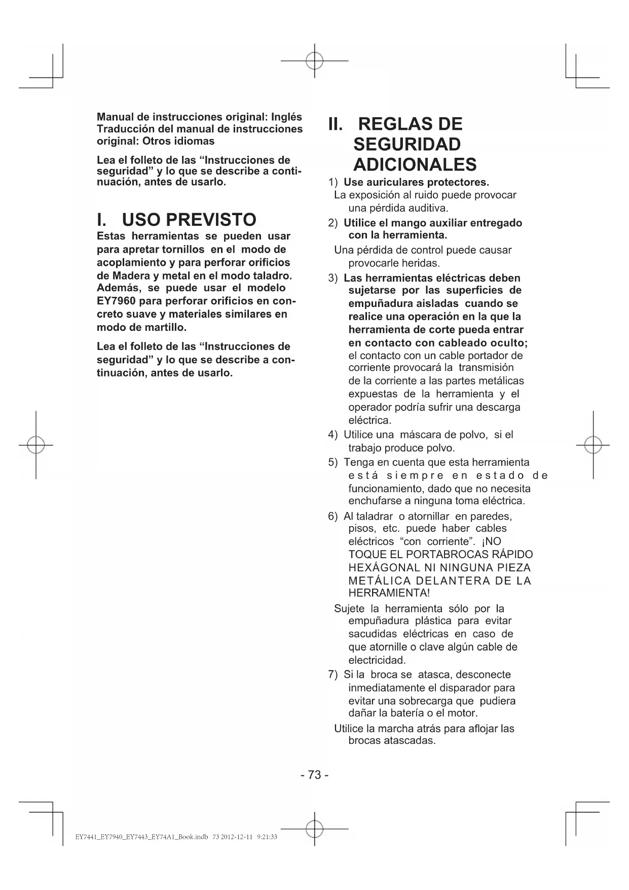 inmediatamente el disparador para evitar una sobrecarga que pudiera dañar la batería o el motor. Utilice la marcha atrás para aojar las brocas atascadas. Manual de instrucciones original: Inglés Traducción del manual de instrucciones original: Otros idiomas Lea el folleto de las “Instrucciones de seguridad” y lo que se describe a conti- nuación, antes de usarlo. EY7441_EY7940_EY7443_EY74A1_Book.indb 73 2012-12-11 9:21:33- 74 -