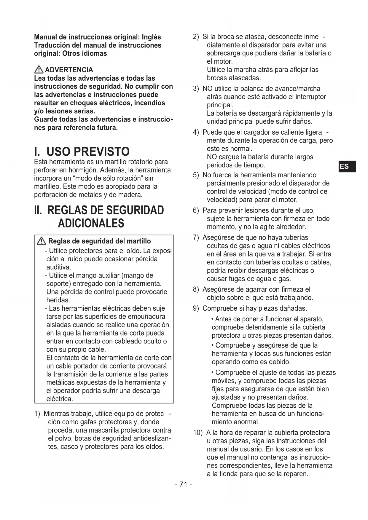 ADICIONALES Reglas de seguridad del martillo - Utilice protectores para el oído. La exposi