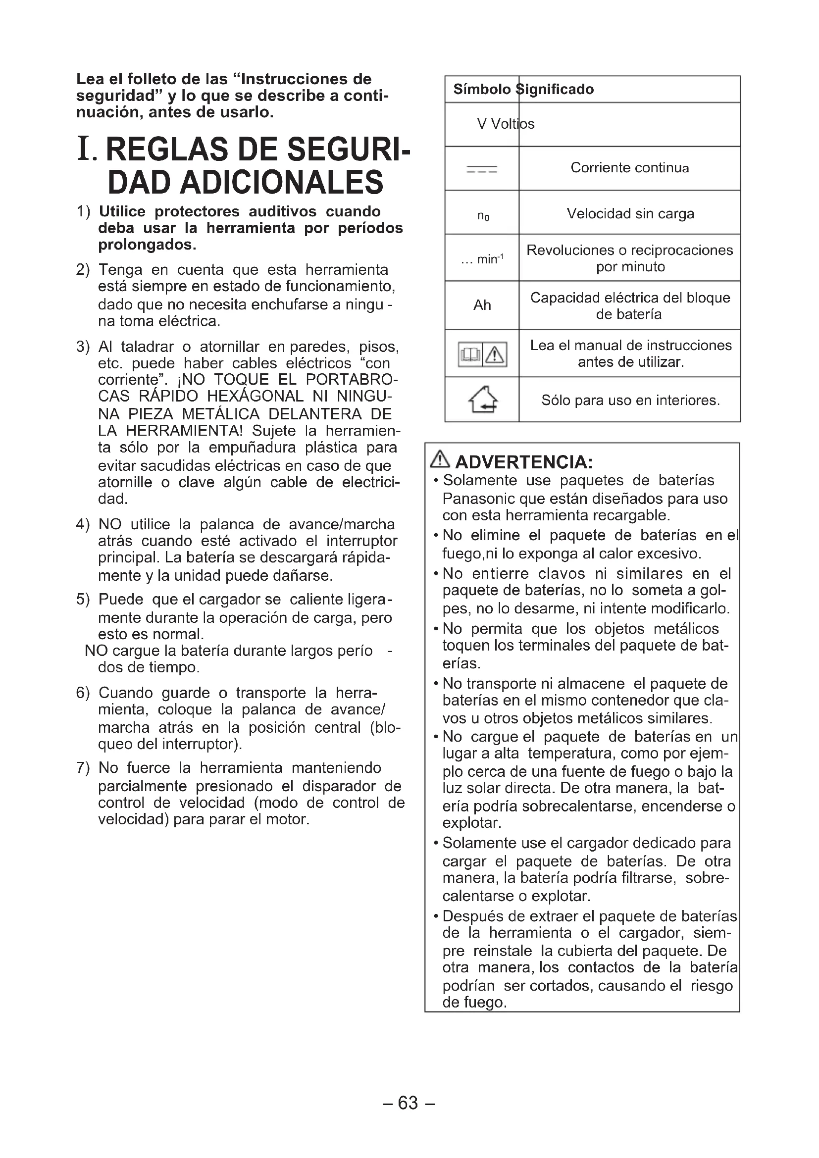 Velocidad sin carga… min Revoluciones o reciprocaciones por minuto Capacidad eléctrica del bloque de bateríaLea el manual de instrucciones antes de utilizar.Sólo para uso en interiores. ADVERTENCIA: