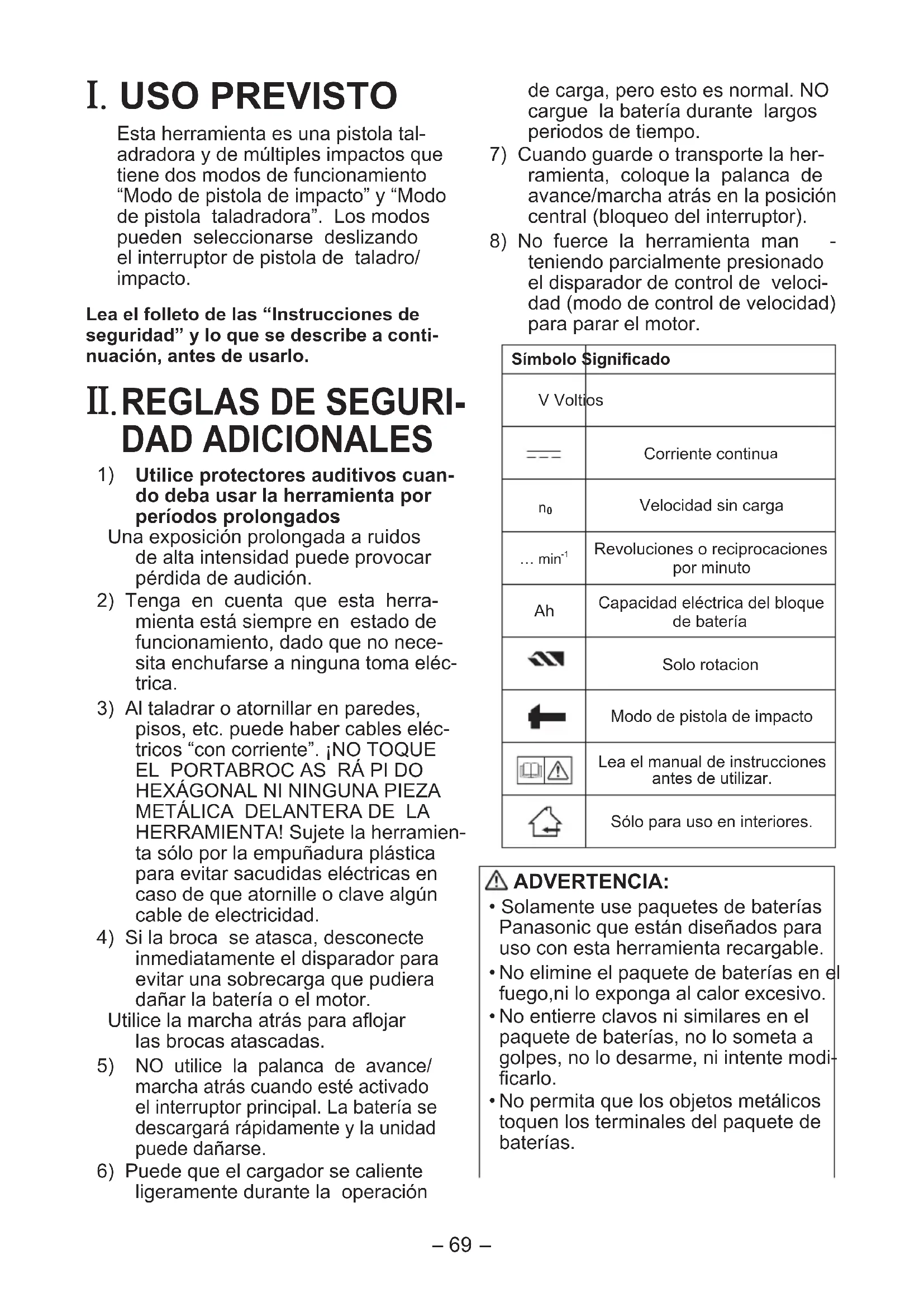 - Solamente use paquetes de baterías Panasonic que está disénados para uso con esta herramienta recargable.