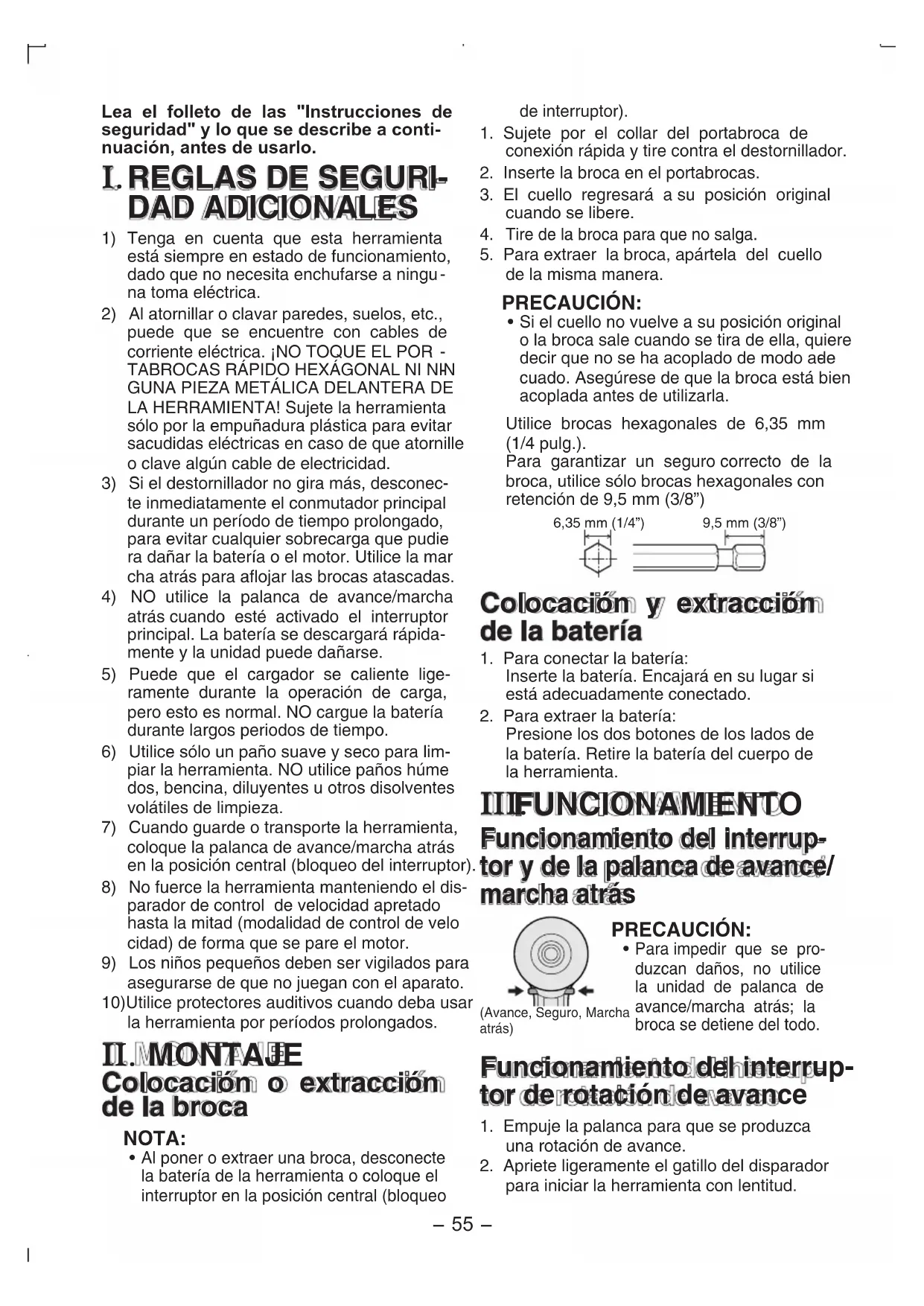 Si el cuello no vuelve a su posición original o la broca sale cuando se tira de ella, quiere decir que no se ha acoplado de modo ade cuado. Asegúrese de que la broca está bien acoplada antes de utilizarla.Utilice brocas hexagonales de 6,35 mm (1/4 pulg.).Para garantizar un seguro correcto de la broca, utilice sólo brocas hexagonales con retención de 9,5 mm (3/8”)6,35 mm (1/4”)9,5 mm (3/8”) Colocación y extracción de la batería 1. Para conectar la batería:Inserte la batería. Encajará en su lugar si está adecuadamente conectado.2. Para extraer la batería:Presione los dos botones de los lados de la batería. Retire la batería del cuerpo de la herramienta. III. FUNCIONAMIENTO Funcionamiento del interrup- tor y de la palanca de avance/ marcha atrás (Avance, Seguro, Marcha atrás) PRECAUCIÓN: