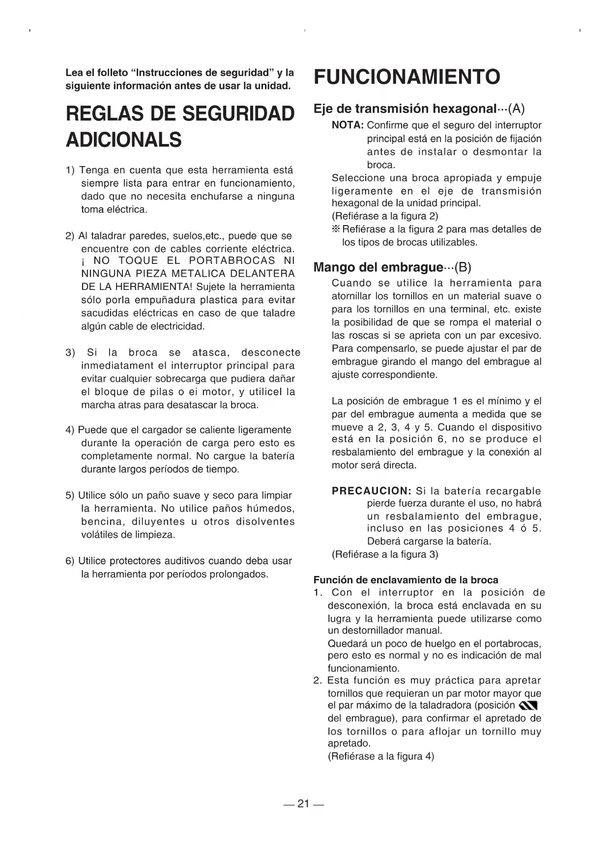 Refiérase a la figura 2 para mas detalles de los tipos de brocas utilizables. Mango del embrague···(B) Cuando se utilice la herramienta para atornillar los tornillos en un material suave o para los tornillos en una terminal, etc. existe la posibilidad de que se rompa el material o las roscas si se aprieta con un par excesivo. Para compensarlo, se puede ajustar el par de embrague girando el mango del embrague al ajuste correspondiente. La posición de embrague 1 es el mínimo y el par del embrague aumenta a medida que se mueve a 2, 3, 4 y 5. Cuando el dispositivo está en la posición 6, no se produce el resbalamiento del embrague y la conexión al motor será directa. PRECAUCION: Si la batería recargable pierde fuerza durante el uso, no habrá un resbalamiento del embrague, incluso en las posiciones 4 ó 5. Deberá cargarse la batería. (Refiérase a la figura 3) Función de enclavamiento de la broca