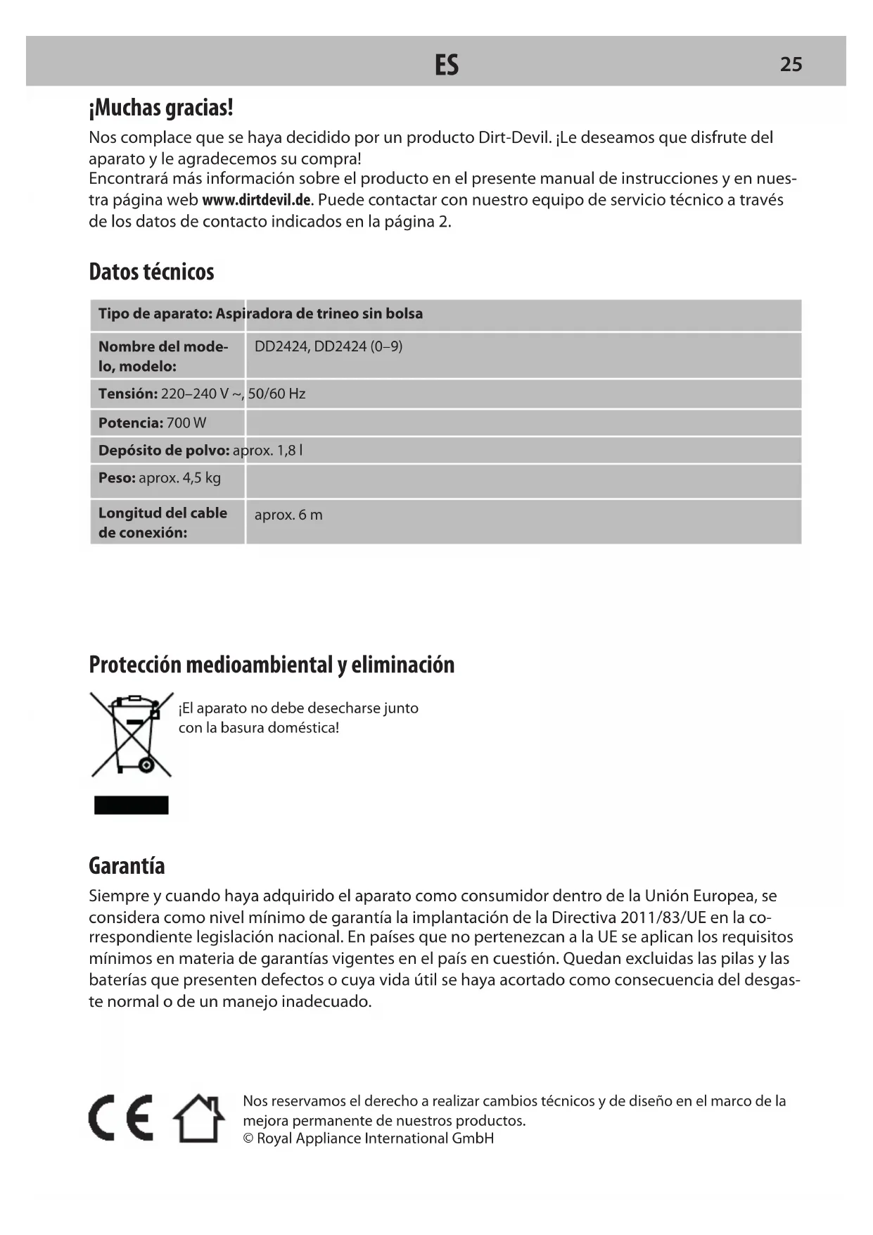 FRProtección medioambiental y eliminación ¡El aparato no debe desecharse junto con la basura doméstica! Garantía Siempre y cuando haya adquirido el aparato como consumidor dentro de la Unión Europea, se considera como nivel mínimo de garantía la implantación de la Directiva 2011/83/UE en la co- rrespondiente legislación nacional. En países que no pertenezcan a la UE se aplican los requisitos mínimos en materia de garantías vigentes en el país en cuestión. Quedan excluidas las pilas y las baterías que presenten defectos o cuya vida útil se haya acortado como consecuencia del desgas- te normal o de un manejo inadecuado. Nos reservamos el derecho a realizar cambios técnicos y de diseño en el marco de la mejora permanente de nuestros productos. © Royal Appliance International GmbH ¡Muchas gracias! Nos complace que se haya decidido por un producto Dirt-Devil. ¡Le deseamos que disfrute del aparato y le agradecemos su compra! Encontrará más información sobre el producto en el presente manual de instrucciones y en nues- tra página web www.dirtdevil.de. Puede contactar con nuestro equipo de servicio técnico a través de los datos de contacto indicados en la página 2. Datos técnicos Tipo de aparato: Aspiradora de trineo sin bolsa Nombre del mode- lo, modelo: DD2424, DD2424 (0–9) Tensión: 220–240 V ~, 50/60 Hz Potencia: 700 W Depósito de polvo: aprox. 1,8 l Peso: aprox. 4,5 kg Longitud del cable de conexión: aprox. 6 m
