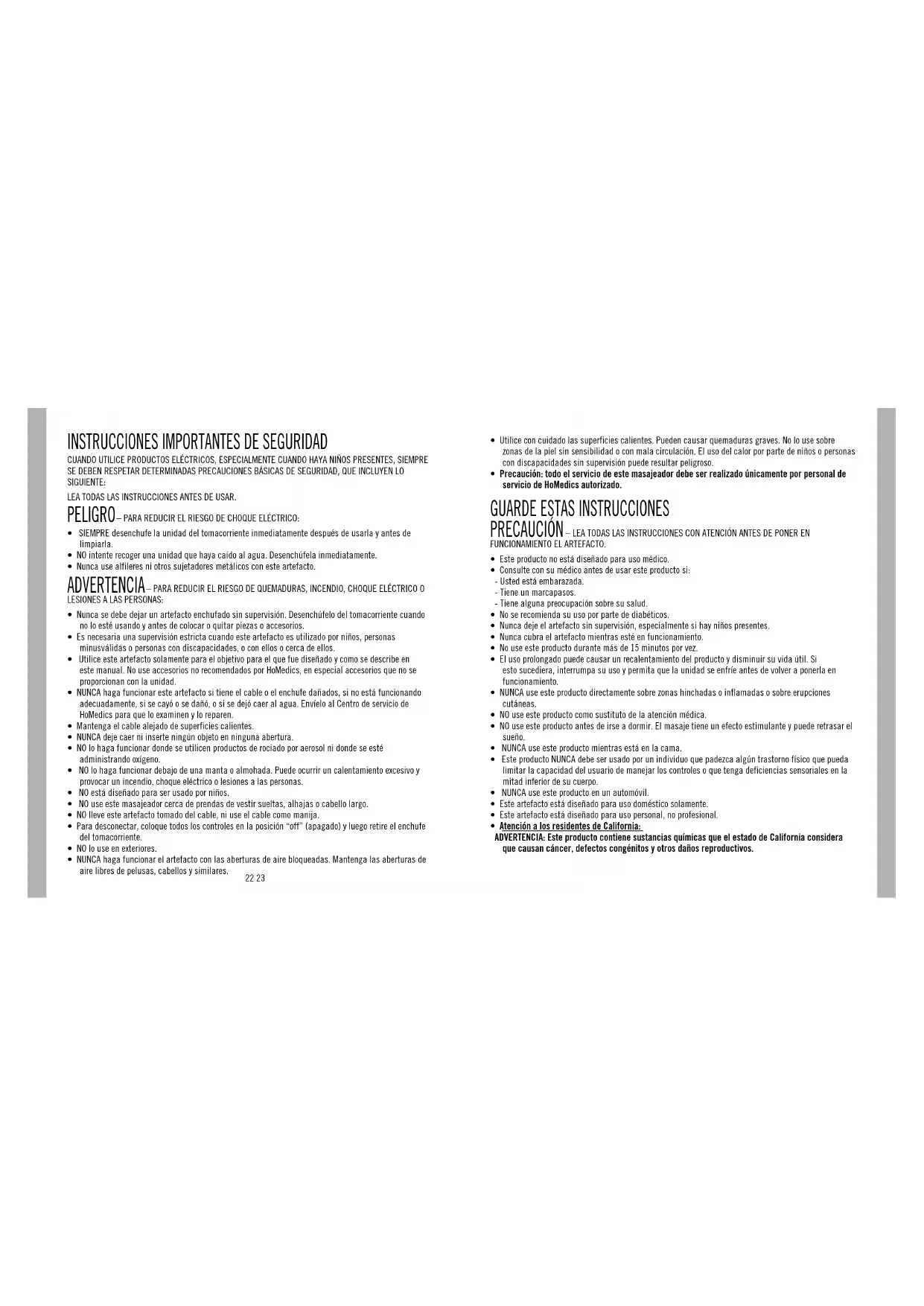 - Utilice este artefacto solamente para el objetivo para el que fue diseñado y como se describe en este manual. No use accesorios no recomendados por HoMedics, en especial accesorios que no se proporcionan con la unidad.