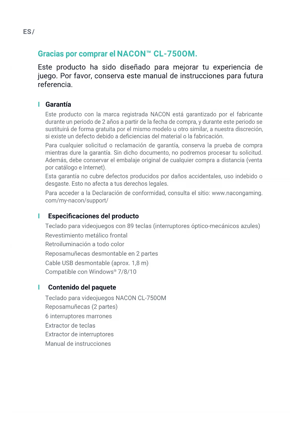 7/8/10 zijn geregistreerde handelsmerken van Microsoft Corporation.ES / Gracias por comprar el NACON™ CL-750OM. Este producto ha sido diseñado para mejorar tu experiencia de juego. Por favor, conserva este manual de instrucciones para futura referencia. I Garantía Este producto con la marca registrada NACON está garantizado por el fabricante durante un periodo de 2 años a partir de la fecha de compra, y durante este periodo se sustituirá de forma gratuita por el mismo modelo u otro similar, a nuestra discreción, si existe un defecto debido a deciencias del material o la fabricación. Para cualquier solicitud o reclamación de garantía, conserva la prueba de compra mientras dure la garantía. Sin dicho documento, no podremos procesar tu solicitud. Además, debe conservar el embalaje original de cualquier compra a distancia (venta por catálogo e Internet). Esta garantía no cubre defectos producidos por daños accidentales, uso indebido o desgaste. Esto no afecta a tus derechos legales. Para acceder a la Declaración de conformidad, consulta el sitio: www.nacongaming. com/my-nacon/support/ I Especicacionesdelproducto Teclado para videojuegos con 89 teclas (interruptores óptico-mecánicos azules) Revestimiento metálico frontal Retroiluminación a todo color Reposamuñecas desmontable en 2 partes Cable USB desmontable (aprox. 1,8 m) Compatible con Windows