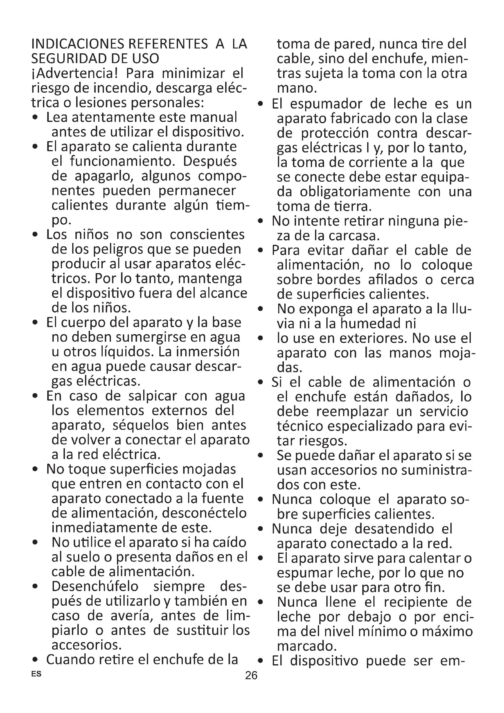 - El espumador de leche es un aparato fabricado con la clase de protección contra descar- gas eléctricas I y, por lo tanto, la toma de corriente a la que se conecte debe estar equipa- da obligatoriamente con una toma de erra.