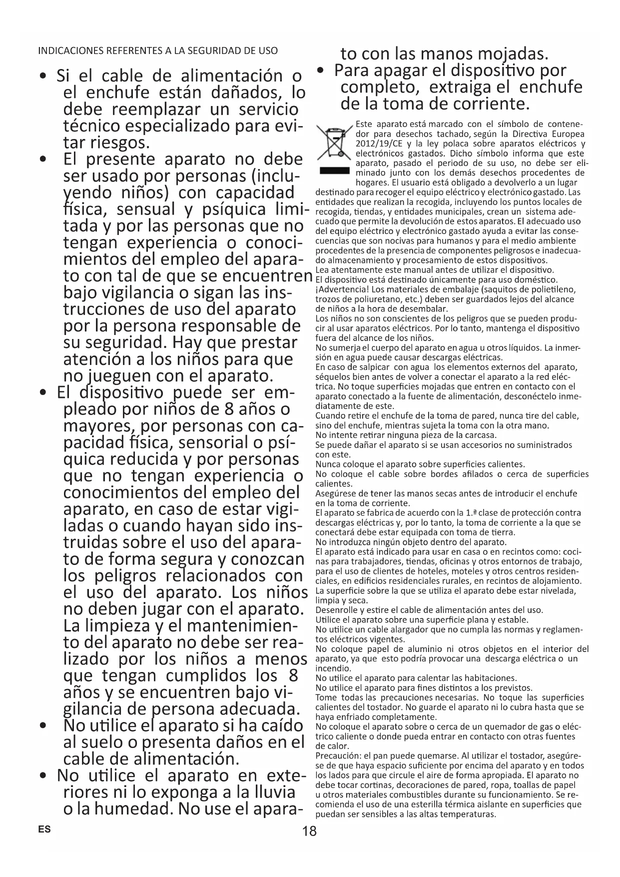 - Para apagar el disposivo por completo, extraiga el enchufe de la toma de corriente. Este aparato está marcado con el símbolo de contene- dor para desechos tachado, según la Direcva Europea 2012/19/CE y la ley polaca sobre aparatos eléctricos y electrónicos gastados. Dicho símbolo informa que este aparato, pasado el periodo de su uso, no debe ser eli- minado junto con los demás desechos procedentes de hogares. El usuario está obligado a devolverlo a un lugar desnado para recoger el equipo eléctrico y electrónico gastado. Las endades que realizan la recogida, incluyendo los puntos locales de recogida, endas, y endades municipales, crean un sistema ade- cuado que permite la devolución de estos aparatos. El adecuado uso del equipo eléctrico y electrónico gastado ayuda a evitar las conse- cuencias que son nocivas para humanos y para el medio ambiente procedentes de la presencia de componentes peligrosos e inadecua- do almacenamiento y procesamiento de estos disposivos. Lea atentamente este manual antes de ulizar el disposivo. El disposivo está desnado únicamente para uso domésco. ¡Advertencia! Los materiales de embalaje (saquitos de polieleno, trozos de poliuretano, etc.) deben ser guardados lejos del alcance de niños a la hora de desembalar. Los niños no son conscientes de los peligros que se pueden produ- cir al usar aparatos eléctricos. Por lo tanto, mantenga el disposivo fuera del alcance de los niños. No sumerja el cuerpo del aparato en agua u otros líquidos. La inmer- sión en agua puede causar descargas eléctricas. En caso de salpicar con agua los elementos externos del aparato, séquelos bien antes de volver a conectar el aparato a la red eléc- trica. No toque supercies mojadas que entren en contacto con el aparato conectado a la fuente de alimentación, desconéctelo inme- diatamente de este. Cuando rere el enchufe de la toma de pared, nunca re del cable, sino del enchufe, mientras sujeta la toma con la otra mano. No intente rerar ninguna pieza de la carcasa. Se puede dañar el aparato si se usan accesorios no suministrados con este. Nunca coloque el aparato sobre supercies calientes. No coloque el cable sobre bordes alados o cerca de supercies calientes. Asegúrese de tener las manos secas antes de introducir el enchufe en la toma de corriente. El aparato se fabrica de acuerdo con la 1.ª clase de protección contra descargas eléctricas y, por lo tanto, la toma de corriente a la que se conectará debe estar equipada con toma de erra. No introduzca ningún objeto dentro del aparato. El aparato está indicado para usar en casa o en recintos como: coci- nas para trabajadores, endas, ocinas y otros entornos de trabajo, para el uso de clientes de hoteles, moteles y otros centros residen- ciales, en edicios residenciales rurales, en recintos de alojamiento. La supercie sobre la que se uliza el aparato debe estar nivelada, limpia y seca. Desenrolle y esre el cable de alimentación antes del uso. Ulice el aparato sobre una supercie plana y estable. No ulice un cable alargador que no cumpla las normas y reglamen- tos eléctricos vigentes. No coloque papel de aluminio ni otros objetos en el interior del aparato, ya que esto podría provocar una descarga eléctrica o un incendio. No ulice el aparato para calentar las habitaciones. No ulice el aparato para nes disntos a los previstos. Tome todas las precauciones necesarias. No toque las supercies calientes del tostador. No guarde el aparato ni lo cubra hasta que se haya enfriado completamente. No coloque el aparato sobre o cerca de un quemador de gas o eléc- trico caliente o donde pueda entrar en contacto con otras fuentes de calor. Precaución: el pan puede quemarse. Al ulizar el tostador, asegúre- se de que haya espacio suciente por encima del aparato y en todos los lados para que circule el aire de forma apropiada. El aparato no debe tocar cornas, decoraciones de pared, ropa, toallas de papel u otros materiales combusbles durante su funcionamiento. Se re- comienda el uso de una esterilla térmica aislante en supercies que puedan ser sensibles a las altas temperaturas.19