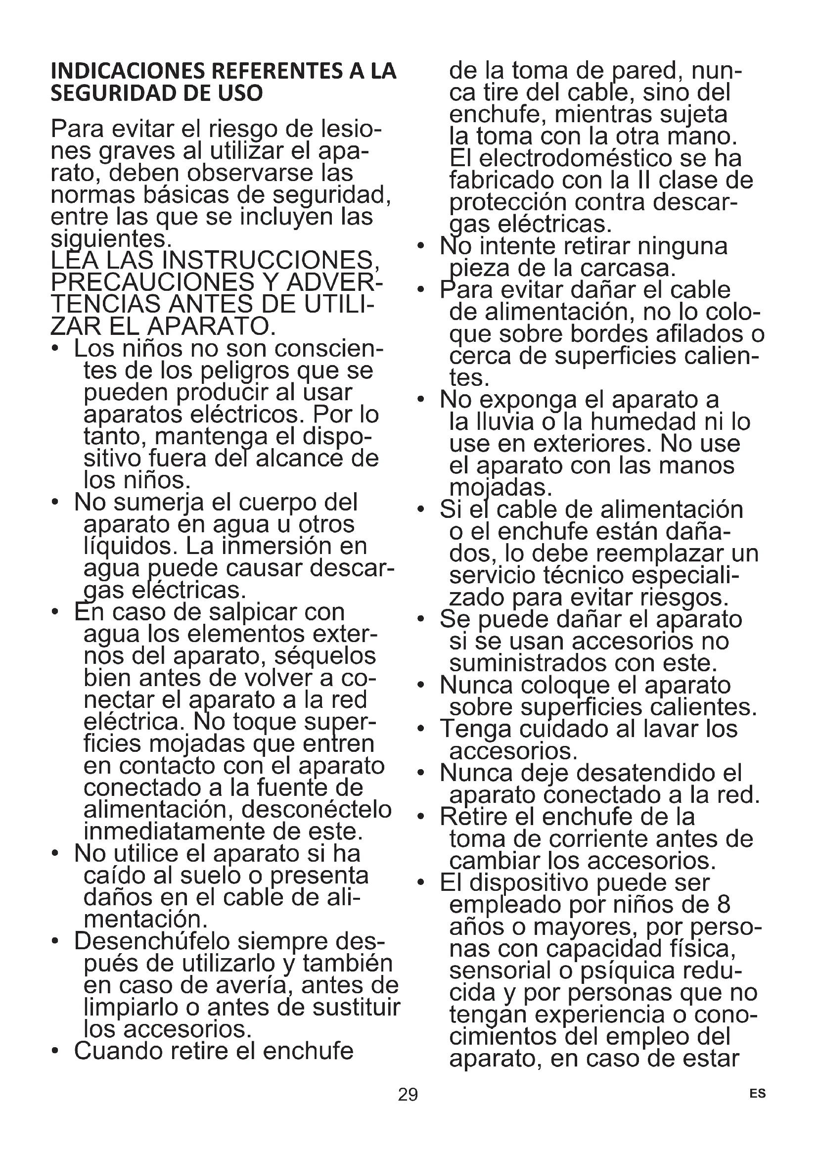 - Cuando retire el enchufe de la toma de pared, nun- ca tire del cable, sino del enchufe, mientras sujeta la toma con la otra mano. El electrodoméstico se ha fabricado con la II clase de protección contra descar- gas eléctricas.