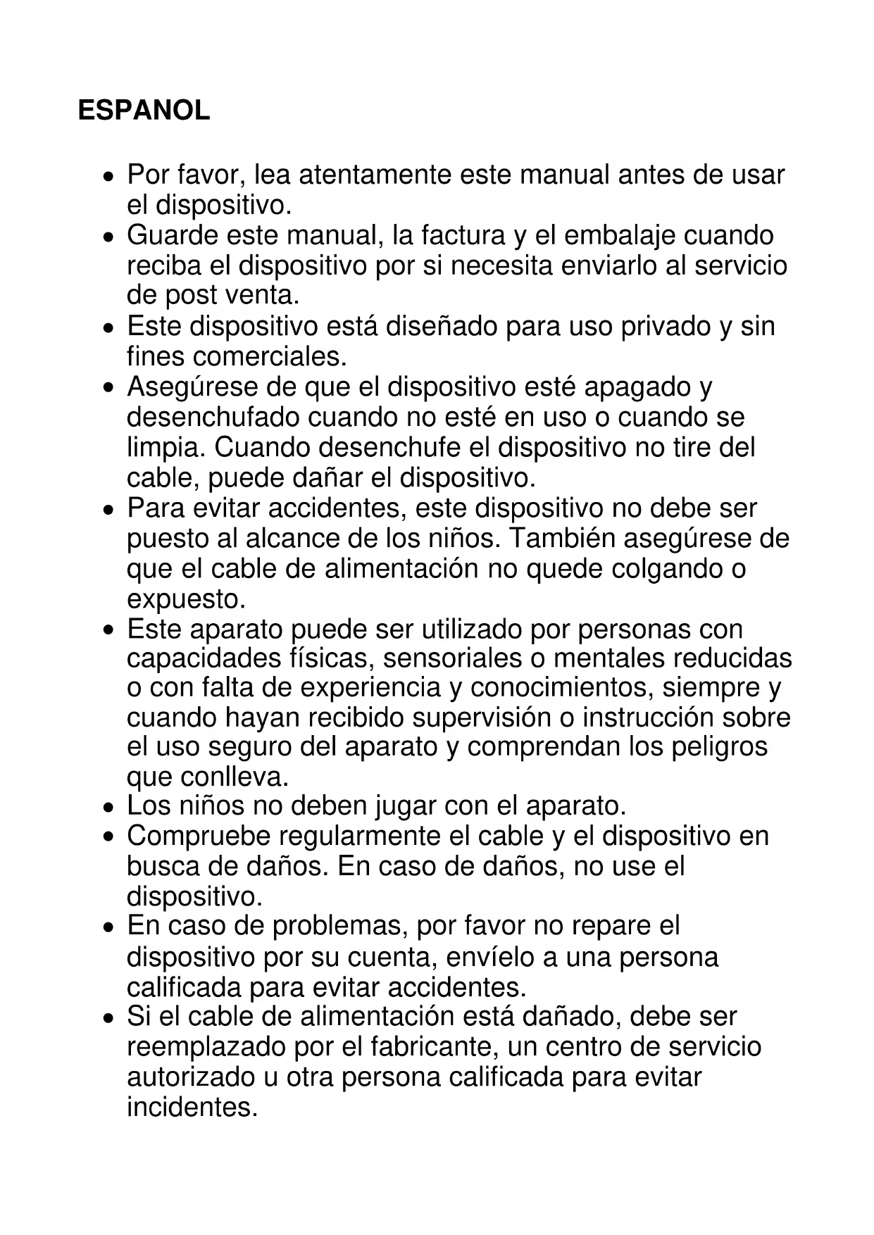 Mantenga el aparato y su cable eléctrico fuera del alcance de niños de menos de 8 años.• El dispositivo no debe utilizarse si se ha caído, si hay signos evidentes de daño o si hay fugas.