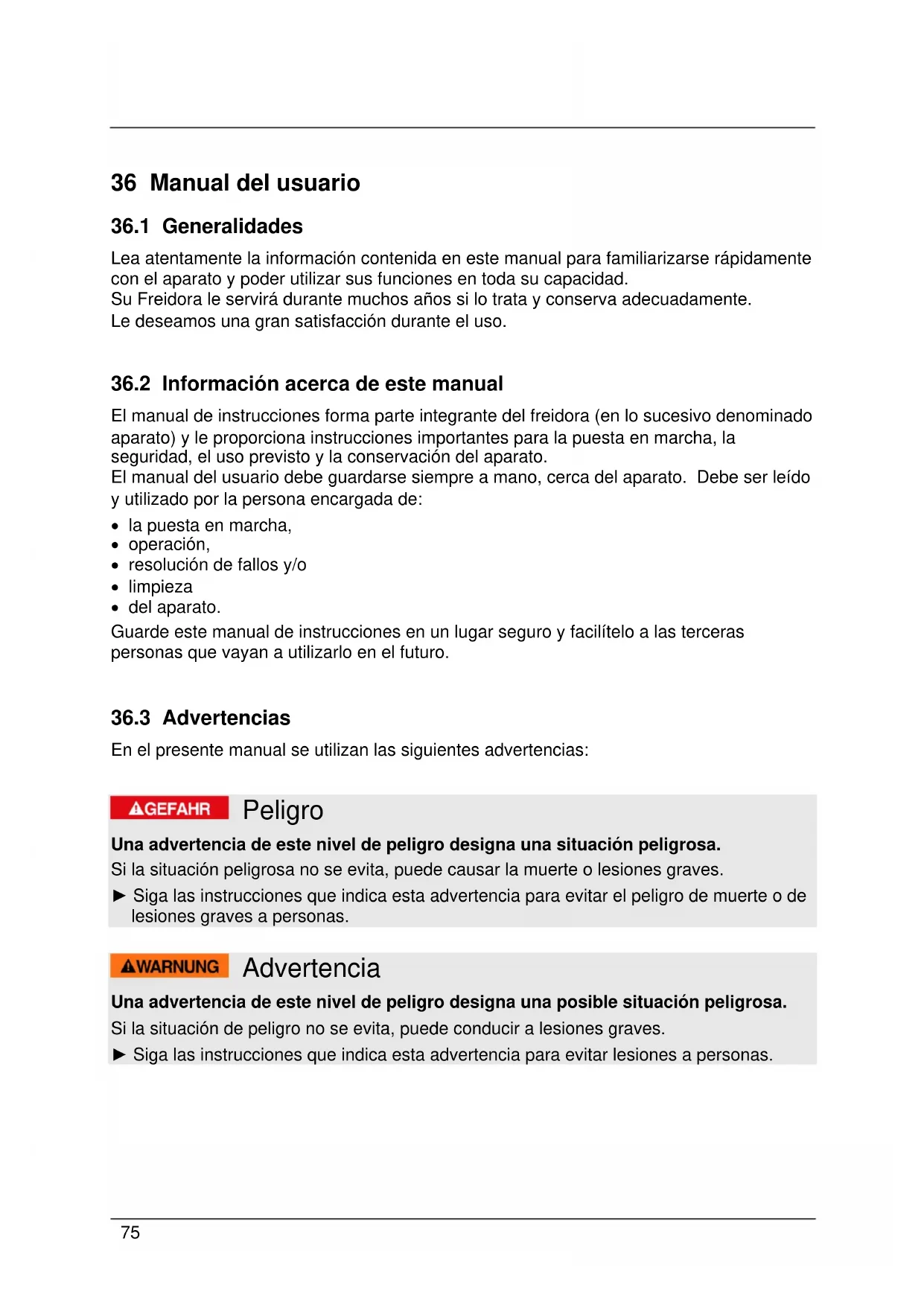 En el presente manual se utilizan las siguientes advertencias: Peligro Una advertencia de este nivel de peligro designa una situación peligrosa. Si la situación peligrosa no se evita, puede causar la muerte o lesiones graves. ► Siga las instrucciones que indica esta advertencia para evitar el peligro de muerte o de lesiones graves a personas. Advertencia Una advertencia de este nivel de peligro designa una posible situación peligrosa. Si la situación de peligro no se evita, puede conducir a lesiones graves. ► Siga las instrucciones que indica esta advertencia para evitar lesiones a personas.76 Precaución Una advertencia de este nivel de peligro designa una posible situación peligrosa. Si la situación de peligro no se evita, puede conducir a lesiones de gravedad moderada a leve. ► Siga las instrucciones que indica esta advertencia para evitar lesiones a personas. Nota Esta indicación designa información adicional que facilitará el manejo de la máquina.