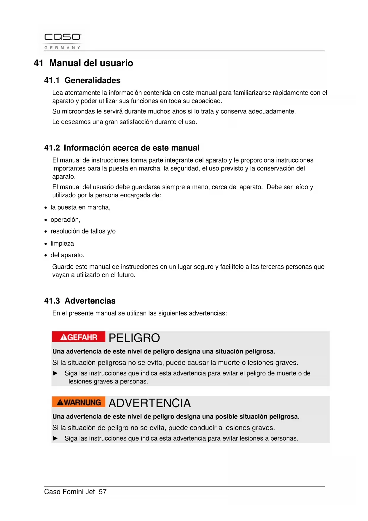 En el presente manual se utilizan las siguientes advertencias: PELIGRO Una advertencia de este nivel de peligro designa una situación peligrosa. Si la situación peligrosa no se evita, puede causar la muerte o lesiones graves. ► Siga las instrucciones que indica esta advertencia para evitar el peligro de muerte o de lesiones graves a personas. ADVERTENCIA Una advertencia de este nivel de peligro designa una posible situación peligrosa. Si la situación de peligro no se evita, puede conducir a lesiones graves. ► Siga las instrucciones que indica esta advertencia para evitar lesiones a personas.Caso Fomini Jet 58 PRECAUCIÓN Una advertencia de este nivel de peligro designa una posible situación peligrosa. Si la situación de peligro no se evita, puede conducir a lesiones de gravedad moderada a leve. ► Siga las instrucciones que indica esta advertencia para ► evitar lesiones a personas. NOTA Esta indicación designa información adicional que facilitará el manejo de la máquina.