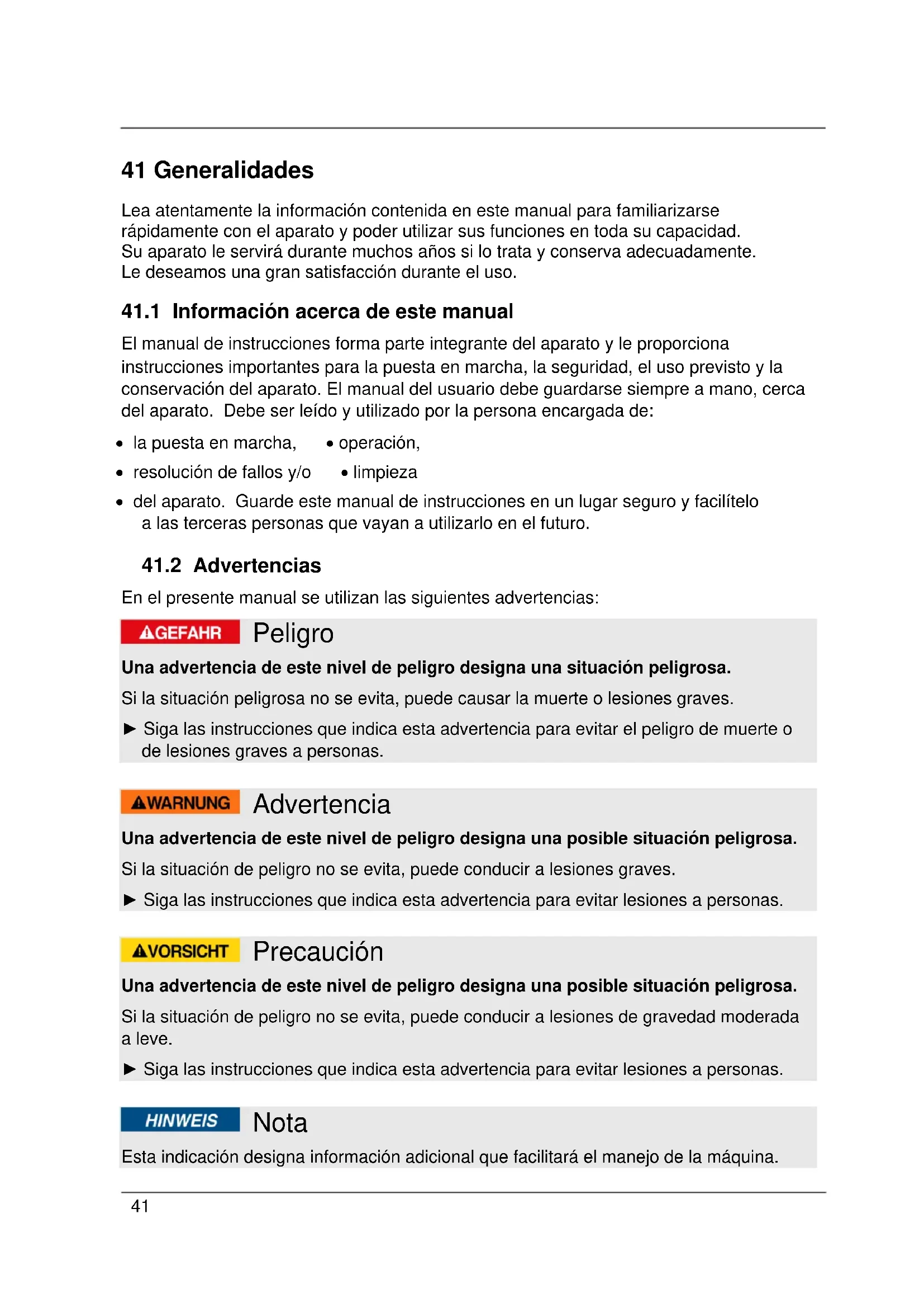 En el presente manual se utilizan las siguientes advertencias: Peligro Una advertencia de este nivel de peligro designa una situación peligrosa. Si la situación peligrosa no se evita, puede causar la muerte o lesiones graves. ► Siga las instrucciones que indica esta advertencia para evitar el peligro de muerte o de lesiones graves a personas. Advertencia Una advertencia de este nivel de peligro designa una posible situación peligrosa. Si la situación de peligro no se evita, puede conducir a lesiones graves. ► Siga las instrucciones que indica esta advertencia para evitar lesiones a personas. Precaución Una advertencia de este nivel de peligro designa una posible situación peligrosa. Si la situación de peligro no se evita, puede conducir a lesiones de gravedad moderada a leve. ► Siga las instrucciones que indica esta advertencia para evitar lesiones a personas. Nota Esta indicación designa información adicional que facilitará el manejo de la máquina.42
