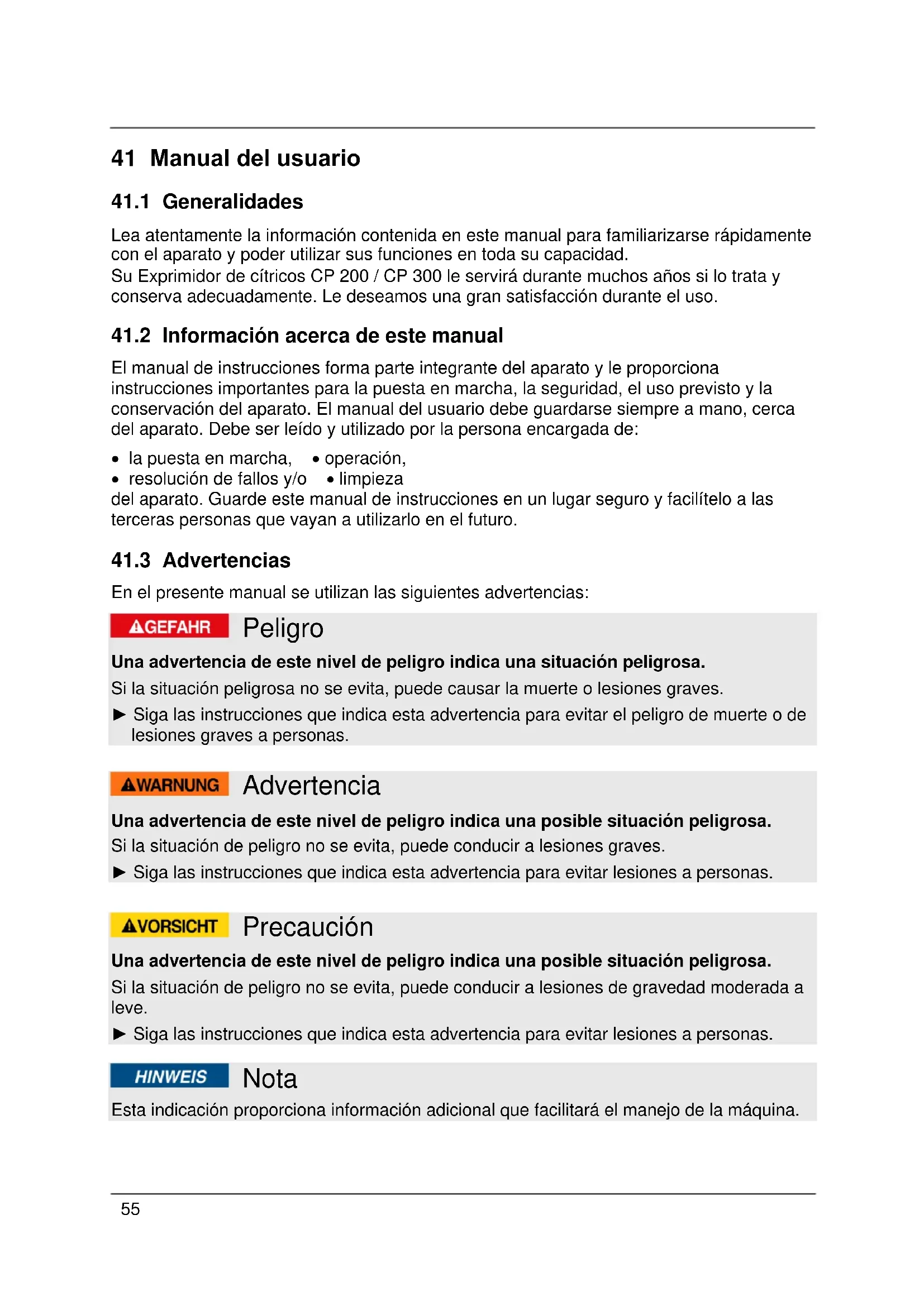 En el presente manual se utilizan las siguientes advertencias: Peligro Una advertencia de este nivel de peligro indica una situación peligrosa. Si la situación peligrosa no se evita, puede causar la muerte o lesiones graves. ► Siga las instrucciones que indica esta advertencia para evitar el peligro de muerte o de lesiones graves a personas. Advertencia Una advertencia de este nivel de peligro indica una posible situación peligrosa. Si la situación de peligro no se evita, puede conducir a lesiones graves. ► Siga las instrucciones que indica esta advertencia para evitar lesiones a personas. Precaución Una advertencia de este nivel de peligro indica una posible situación peligrosa. Si la situación de peligro no se evita, puede conducir a lesiones de gravedad moderada a leve. ► Siga las instrucciones que indica esta advertencia para evitar lesiones a personas. Nota Esta indicación proporciona información adicional que facilitará el manejo de la máquina.56 42 Seguridad En este capítulo obtendrá importantes instrucciones de seguridad sobre la manipulación del aparato. Este aparato cumple la normativa de seguridad vigente. No obstante, el uso indebido puede causar lesiones a personas y daños materiales.