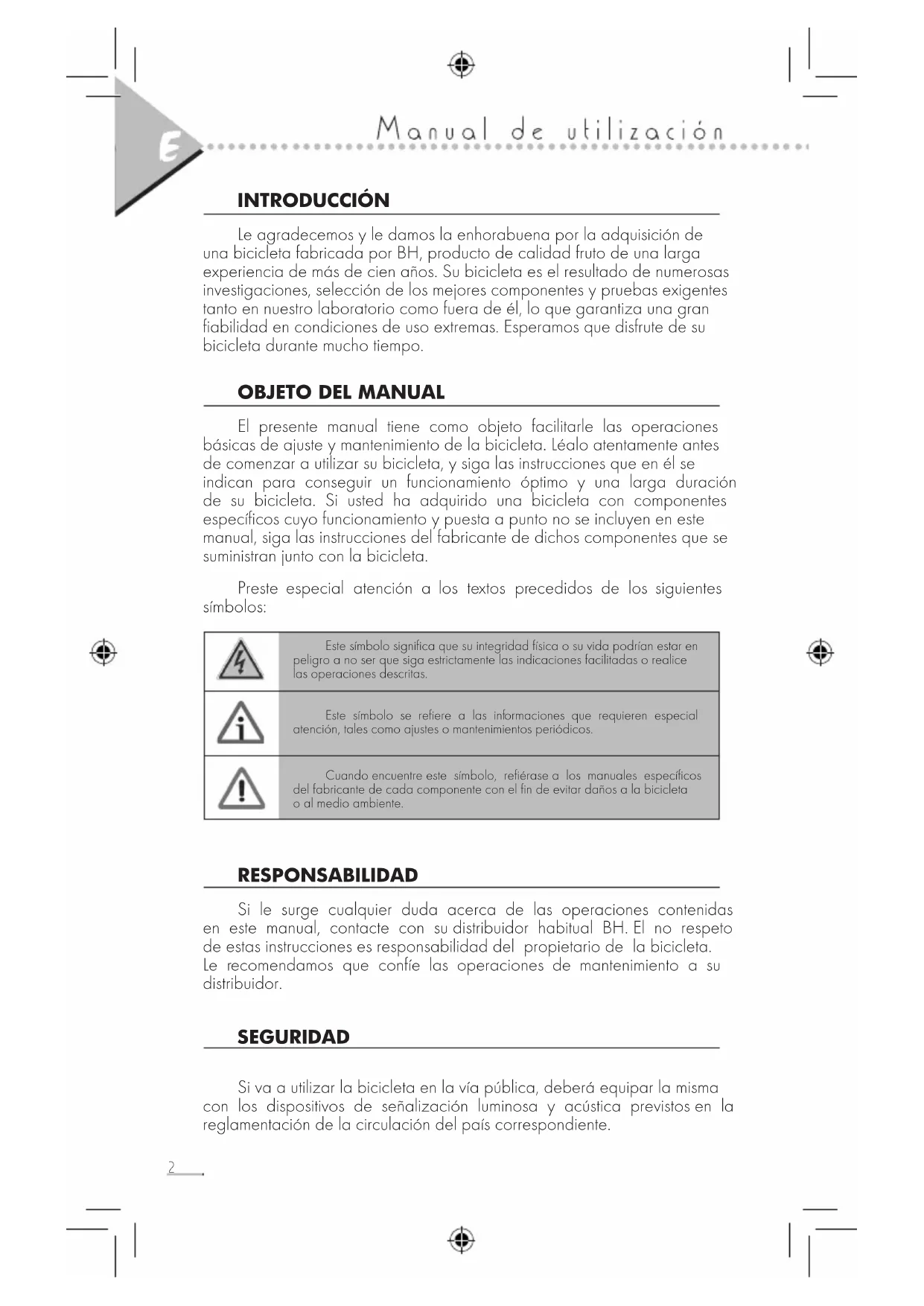 Le agradecemos y le damos la enhorabuena por la adquisición de una bicicleta fabricada por BH, producto de calidad fruto de una larga experiencia de más de cien años. Su bicicleta es el resultado de numerosas investigaciones, selección de los mejores componentes y pruebas exigentes tanto en nuestro laboratorio como fuera de él, lo que garantiza una gran fiabilidad en condiciones de uso extremas. Esperamos que disfrute de su bicicleta durante mucho tiempo.