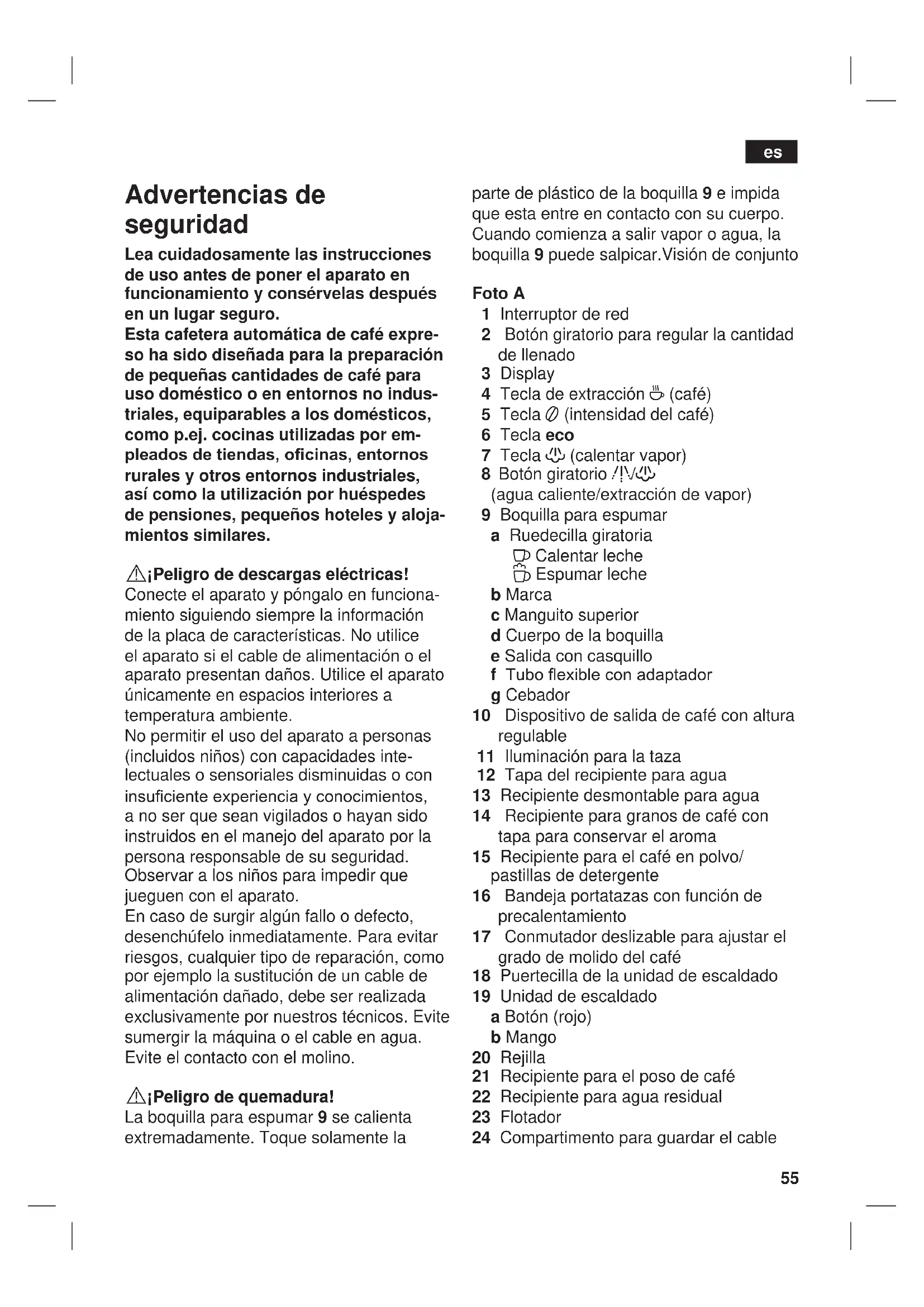 ! ¡Peligro de quemadura!eligro de quemadura! La boquilla para espumar 9 se calienta extremadamente. Toque solamente la parte de plástico de la boquilla 9 e impida que esta entre en contacto con su cuerpo. Cuando comienza a salir vapor o agua, la boquilla 9 puede salpicar.Visión de conjunto Foto A 1 Interruptor de red 2 Botón giratorio para regular la cantidad de llenado 3 Display 4 Tecla de extracción 4 (café) 5 Tecla 5 (intensidad del café) 6 Tecla eco 7 Tecla h (calentar vapor) 8 Botón giratorio g/h (agua caliente/extracción de vapor) 9 Boquilla para espumar a Ruedecilla giratoria V Calentar leche W Espumar leche b Marca c Manguito superior d Cuerpo de la boquilla e Salida con casquillo f Tubo exible con adaptador g Cebador 10 Dispositivo de salida de café con altura regulable 11 Iluminación para la taza 12 Tapa del recipiente para agua 13 Recipiente desmontable para agua 14 Recipiente para granos de café con tapa para conservar el aroma 15 Recipiente para el café en polvo/ pastillas de detergente 16 Bandeja portatazas con función de precalentamiento 17 Conmutador deslizable para ajustar el grado de molido del café 18 Puertecilla de la unidad de escaldado 19 Unidad de escaldado a Botón (rojo) b Mango 20 Rejilla 21 Recipiente para el poso de café 22 Recipiente para agua residual 23 Flotador 24 Compartimento para guardar el cable56 dees Preparación del aparato antes de usarlo por primera vez Aspectos generales Llene los recipientes únicamente con agua pura sin gas y preferiblemente con mezclas de granos de café aptas para máquinas automáticas o para café expreso. Evite el uso de granos glaseados, caramelizados o azucarados, ya que provocan la obstrucción del molino. Compruebe el grado de dureza del agua con la tira de comprobación adjunta. Si el valor obtenido no es igual a 4, se deberá programar la máquina correctamente (consulte el capítulo sobre el ajuste del grado de dureza del agua). Puesta en funcionamiento Coloque la máquina en una supercie plana impermeable. Extraiga del compartimento el cable que necesite y conéctelo. Retire el recipiente de agua 13, límpielo y llénelo de agua fría hasta el máximo nivel «max». Coloque el recipiente de agua 13 sin ladearlo y empújelo hacia abajo. Llene el recipiente para granos de café con café en grano. Asegúrese de que el botón giratorio 8 se encuentra en