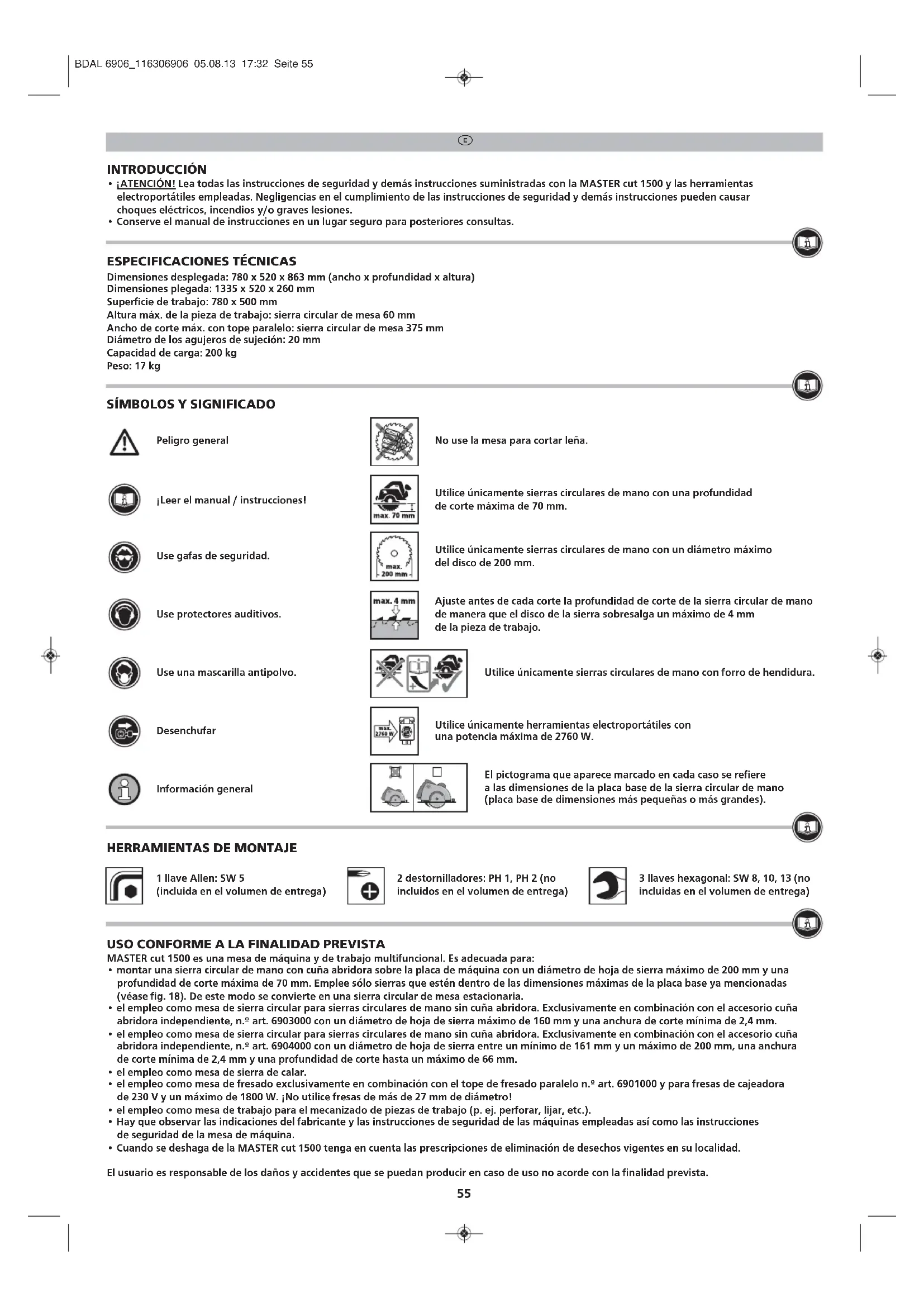- Cuando se deshaga de la MASTER cut 1500 tenga en cuenta las prescripciones de eliminación de desechos vigentes en su localidad. El usuario es responsable de los daños y accidentes que se puedan producir en caso de uso no acorde con la finalidad prevista. Utilice únicamente herramientas electroportátiles con una potencia máxima de 2760 W. BDAL 6906_116306906 05.08.13 17:32 Seite 5556