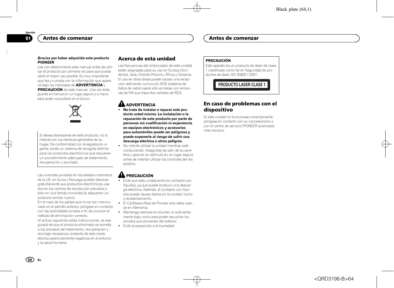 Si esta unidad no funciona correctamente,pongase en contacto con su concesionario o con el centro de servicios PIONEER autorizzato más cercano.