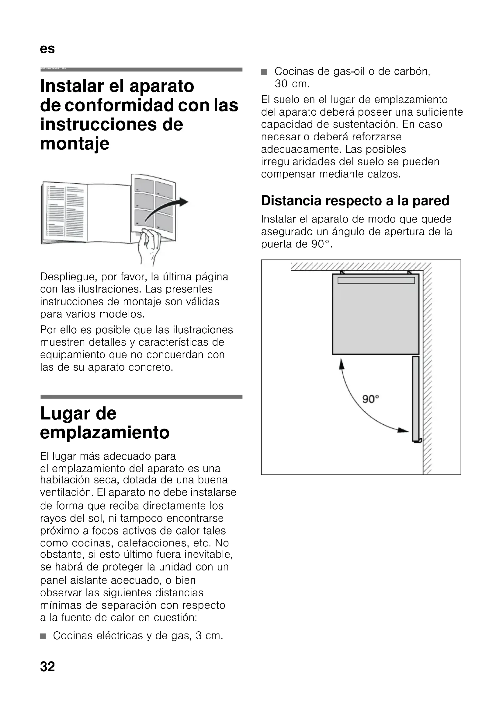 esÍndi ce esInstrucciones de montaje Ap ara to de libr e in stalac ión Instalar el aparato de conformidad con las instrucciones de montaje Despliegue, por favor, la última página con las ilustraciones. Las presentes instrucciones de montaje son válidas para varios modelos. Por ello es posible que las ilustraciones muestren detalles y características de equipamiento que no concuerdan con las de su aparato concreto. Lugar de emplazamiento El lugar más adecuado para el emplazamiento del aparato es una habitación seca, dotada de una buena ventilación. El aparato no debe instalarse de forma que reciba directamente los rayos del sol, ni tampoco encontrarse próximo a focos activos de calor tales como cocinas, calefacciones, etc. No obstante, si esto último fuera inevitable, se habrá de proteger la unidad con un panel aislante adecuado, o bien observar las siguientes distancias mínimas de separación con respecto a la fuente de calor en cuestión: ■ Cocinas eléctricas y de gas, 3 cm. ■ Cocinas de gas-oil o de carbón, 30 cm. El suelo en el lugar de emplazamiento del aparato deberá poseer una suficiente capacidad de sustentación. En caso necesario deberá reforzarse adecuadamente. Las posibles irregularidades del suelo se pueden compensar mediante calzos. Distancia respecto a la pared Instalar el aparato de modo que quede asegurado un ángulo de apertura de la puerta de 90°.es