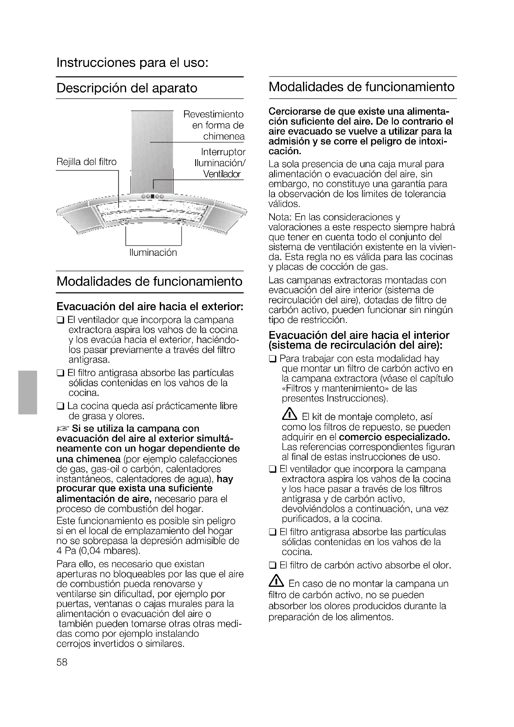 Si se utiliza la campana con evacuación del aire al exterior simultá- neamente con un hogar dependiente de una chimenea (por ejemplo calefacciones de gas, gas-oil o carbón, calentadores instantáneos, calentadores de agua), hay procurar que exista una suficiente alimentación de aire, necesario para el proceso de combustión del hogar. Este funcionamiento es posible sin peligro si en el local de emplazamiento del hogar no se sobrepasa la depresión admisible de 4 Pa (0,04 mbares). Para ello, es necesario que existan aperturas no bloqueables por las que el aire de combustión pueda renovarse y ventilarse sin dificultad, por ejemplo por puertas, ventanas o cajas murales para la alimentación o evacuación del aire o también pueden tomarse otras otras medidas como por ejemplo instalando cerrojos invertidos o similares. Cerciorarse de que existe una alimenta- ción suficiente del aire. De lo contrario el aire evacuado se vuelve a utilizar para la admisión y se corre el peligro de intoxi- cación. La sola presencia de una caja mural para alimentación o evacuación del aire, sin embargo, no constituye una garantía para la observación de los límites de tolerancia válidos. Nota: En las consideraciones y valoraciones a este respecto siempre habrá que tener en cuenta todo el conjunto del sistema de ventilación existente en la vivienda. Esta regla no es válida para las cocinas y placas de cocción de gas. Las campanas extractoras montadas con evacuación del aire interior (sistema de recirculación del aire), dotadas de filtro de carbón activo, pueden funcionar sin ningún tipo de restricción. Si el aire es evacuado pasando a través de la pared exterior, deberá utilizarse una caja mural telescópica. Funcionamiento con evacuación del aire al exterior