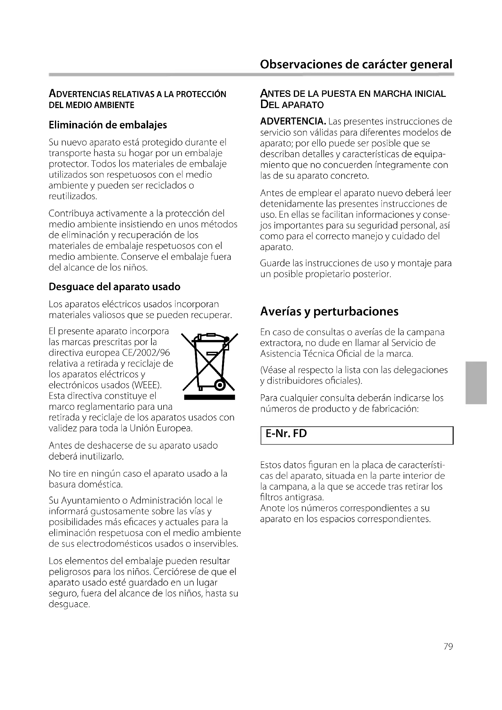 Eliminación de embalajes Su nuevo aparato está protegido durante el transporte hasta su hogar por un embalaje protector. Todos los materiales de embalaje utilizados son respetuosos con el medio ambiente y pueden ser reciclados o reutilizados. Contribuya activamente a la protección del medio ambiente insistiendo en unos métodos de eliminación y recuperación de los materiales de embalaje respetuosos con el medio ambiente. Conserve el embalaje fuera del alcance de los niños. Desguace del aparato usado Los aparatos eléctricos usados incorporan materiales valiosos que se pueden recuperar. El presente aparato incorpora las marcas prescritas por la directiva europea CE/2002/96 relativa a retirada y reciclaje de los aparatos eléctricos y electrónicos usados (WEEE). Esta directiva constituye el marco reglamentario para una retirada y reciclaje de los aparatos usados con validez para toda la Unión Europea. Antes de deshacerse de su aparato usado deberá inutilizarlo. No tire en ningún caso el aparato usado a la basura doméstica. Su Ayuntamiento o Administración local le informará gustosamente sobre las vías y posibilidades más ecaces y actuales para la eliminación respetuosa con el medio ambiente de sus electrodomésticos usados o inservibles. Los elementos del embalaje pueden resultar peligrosos para los niños. Cerciórese de que el aparato usado esté guardado en un lugar seguro, fuera del alcance de los niños, hasta su desguace. Averías y perturbaciones En caso de consultas o averías de la campana extractora, no dude en llamar al Servicio de Asistencia Técnica Ocial de la marca. (Véase al respecto la lista con las delegaciones y distribuidores ociales). Para cualquier consulta deberán indicarse los números de producto y de fabricación: Estos datos guran en la placa de característi- cas del aparato, situada en la parte interior de la campana, a la que se accede tras retirar los ltros antigrasa. Anote los números correspondientes a su aparato en los espacios correspondientes. Observaciones de carácter general )80 Uso correcto del aparato
