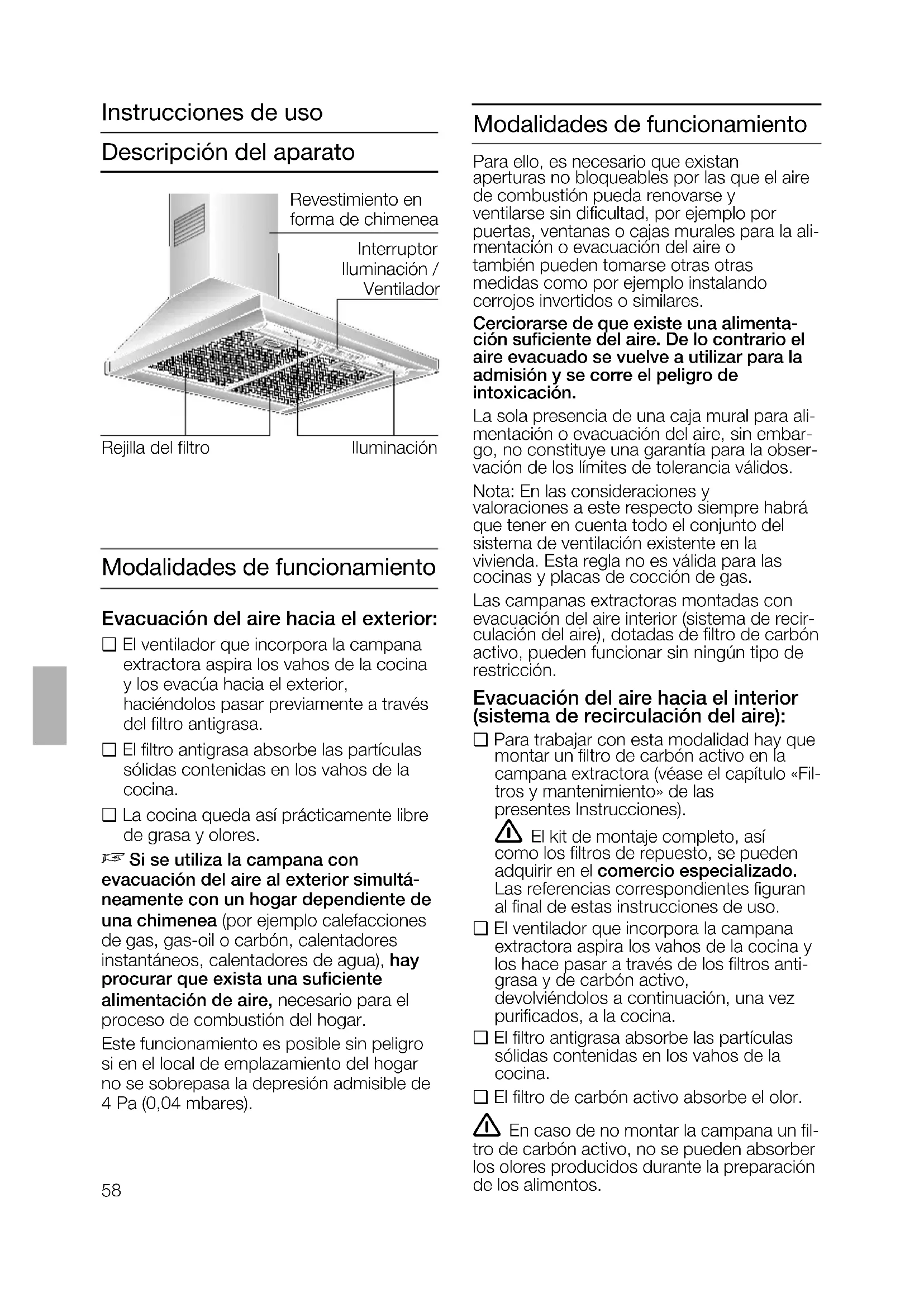 Si se utiliza la campana con evacuación del aire al exterior simultá- neamente con un hogar dependiente de una chimenea (por ejemplo calefacciones de gas, gas-oil o carbón, calentadores instantáneos, calentadores de agua), hay procurar que exista una suficiente alimentación de aire, necesario para el proceso de combustión del hogar. Este funcionamiento es posible sin peligro si en el local de emplazamiento del hogar no se sobrepasa la depresión admisible de 4 Pa (0,04 mbares). Para ello, es necesario que existan aperturas no bloqueables por las que el aire de combustión pueda renovarse y ventilarse sin dificultad, por ejemplo por puertas, ventanas o cajas murales para la alimentación o evacuación del aire o también pueden tomarse otras otras medidas como por ejemplo instalando cerrojos invertidos o similares. Cerciorarse de que existe una alimenta- ción suficiente del aire. De lo contrario el aire evacuado se vuelve a utilizar para la admisión y se corre el peligro de intoxi- cación. La sola presencia de una caja mural para alimentación o evacuación del aire, sin embargo, no constituye una garantía para la observación de los límites de tolerancia válidos. Nota: En las consideraciones y valoraciones a este respecto siempre habrá que tener en cuenta todo el conjunto del sistema de ventilación existente en la vivienda. Esta regla no es válida para las cocinas y placas de cocción de gas. Las campanas extractoras montadas con evacuación del aire interior (sistema de recirculación del aire), dotadas de filtro de carbón activo, pueden funcionar sin ningún tipo de restricción. Si el aire es evacuado pasando a través de la pared exterior, deberá utilizarse una caja mural telescópica.