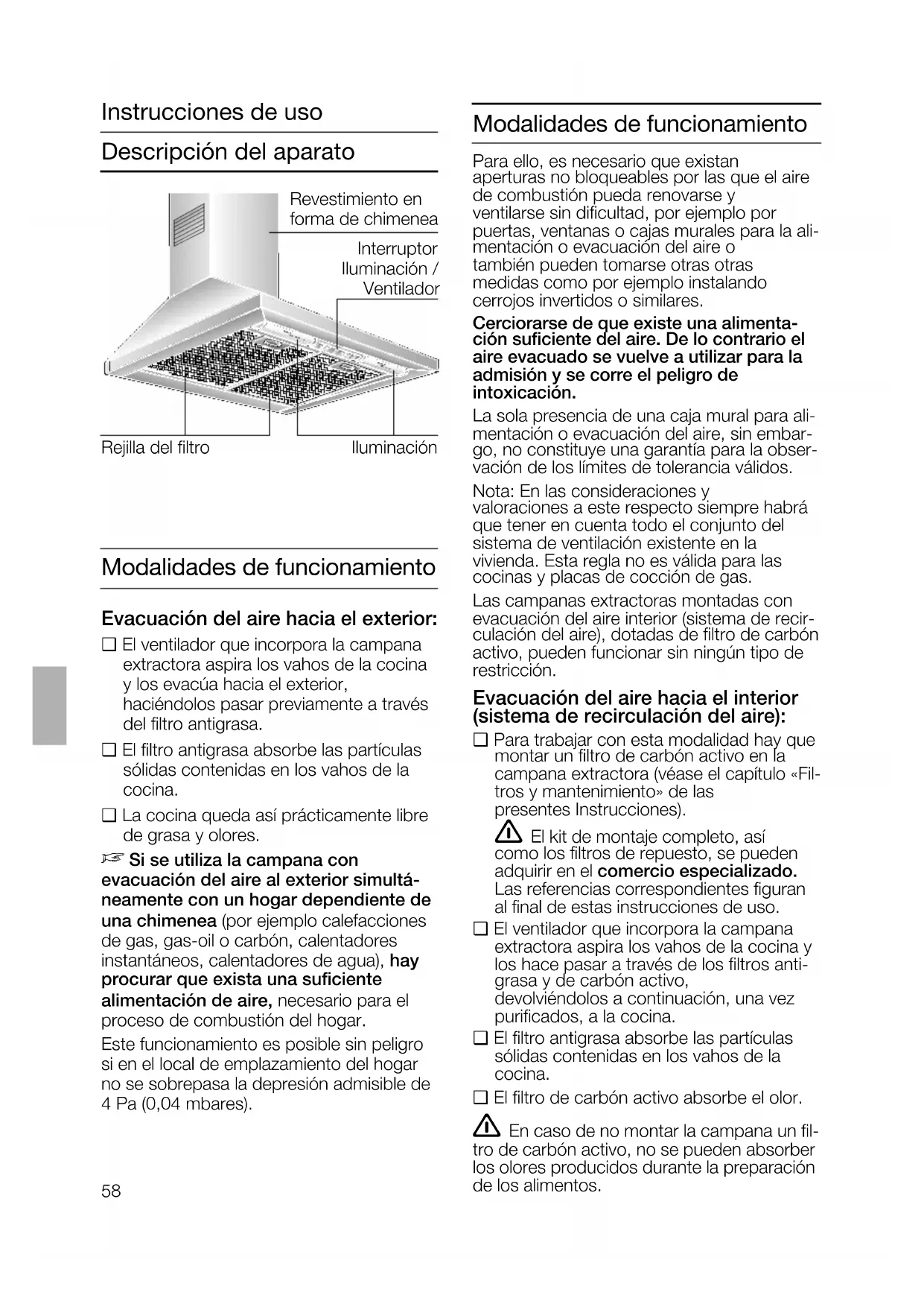 Si se utiliza la campana con evacuación del aire al exterior simultá- neamente con un hogar dependiente de una chimenea (por ejemplo calefacciones de gas, gas-oil o carbón, calentadores instantáneos, calentadores de agua), hay procurar que exista una suficiente alimentación de aire, necesario para el proceso de combustión del hogar. Este funcionamiento es posible sin peligro si en el local de emplazamiento del hogar no se sobrepasa la depresión admisible de 4 Pa (0,04 mbares). Para ello, es necesario que existan aperturas no bloqueables por las que el aire de combustión pueda renovarse y ventilarse sin dificultad, por ejemplo por puertas, ventanas o cajas murales para la alimentación o evacuación del aire o también pueden tomarse otras otras medidas como por ejemplo instalando cerrojos invertidos o similares. Cerciorarse de que existe una alimenta- ción suficiente del aire. De lo contrario el aire evacuado se vuelve a utilizar para la admisión y se corre el peligro de intoxi- cación. La sola presencia de una caja mural para alimentación o evacuación del aire, sin embargo, no constituye una garantía para la observación de los límites de tolerancia válidos. Nota: En las consideraciones y valoraciones a este respecto siempre habrá que tener en cuenta todo el conjunto del sistema de ventilación existente en la vivienda. Esta regla no es válida para las cocinas y placas de cocción de gas. Las campanas extractoras montadas con evacuación del aire interior (sistema de recirculación del aire), dotadas de filtro de carbón activo, pueden funcionar sin ningún tipo de restricción. Si el aire es evacuado pasando a través de la pared exterior, deberá utilizarse una caja mural telescópica.
