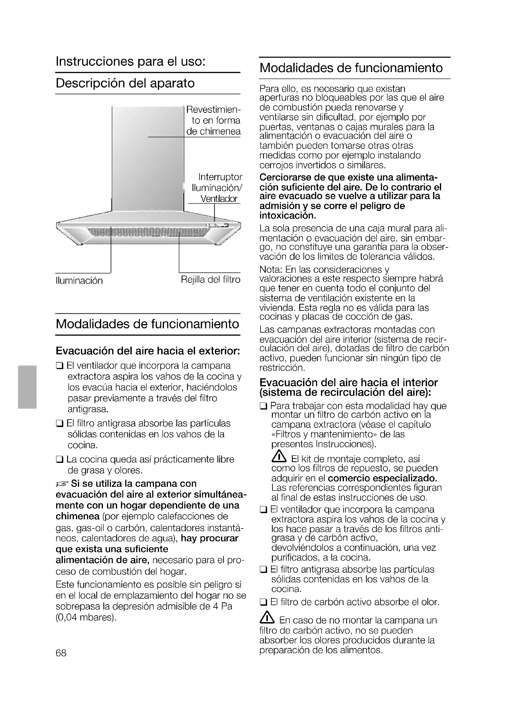 Si se utiliza la campana con evacuación del aire al exterior simultá- neamente con un hogar dependiente de una chimenea (por ejemplo calefacciones de gas, gas-oil o carbón, calentadores instantáneos, calentadores de agua), hay procurar que exista una suficiente alimentación de aire, necesario para el proceso de combustión del hogar. Este funcionamiento es posible sin peligro si en el local de emplazamiento del hogar no se sobrepasa la depresión admisible de 4 Pa (0,04 mbares). Para ello, es necesario que existan aperturas no bloqueables por las que el aire de combustión pueda renovarse y ventilarse sin dificultad, por ejemplo por puertas, ventanas o cajas murales para la alimentación o evacuación del aire o también pueden tomarse otras otras medidas como por ejemplo instalando cerrojos invertidos o similares. Cerciorarse de que existe una alimenta- ción suficiente del aire. De lo contrario el aire evacuado se vuelve a utilizar para la admisión y se corre el peligro de intoxi- cación. La sola presencia de una caja mural para alimentación o evacuación del aire, sin embargo, no constituye una garantía para la observación de los límites de tolerancia válidos. Nota: En las consideraciones y valoraciones a este respecto siempre habrá que tener en cuenta todo el conjunto del sistema de ventilación existente en la vivienda. Esta regla no es válida para las cocinas y placas de cocción de gas. Las campanas extractoras montadas con evacuación del aire interior (sistema de recirculación del aire), dotadas de filtro de carbón activo, pueden funcionar sin ningún tipo de restricción. Si el aire es evacuado pasando a través de la pared exterior, deberá utilizarse una caja mural telescópica. Funcionamiento con evacuación del aire al exterior