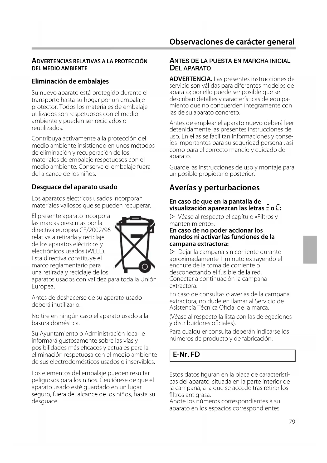 Eliminación de embalajes Su nuevo aparato está protegido durante el transporte hasta su hogar por un embalaje protector. Todos los materiales de embalaje utilizados son respetuosos con el medio ambiente y pueden ser reciclados o reutilizados. Contribuya activamente a la protección del medio ambiente insistiendo en unos métodos de eliminación y recuperación de los materiales de embalaje respetuosos con el medio ambiente. Conserve el embalaje fuera del alcance de los niños. Desguace del aparato usado Los aparatos eléctricos usados incorporan materiales valiosos que se pueden recuperar. El presente aparato incorpora las marcas prescritas por la directiva europea CE/2002/96 relativa a retirada y reciclaje de los aparatos eléctricos y electrónicos usados (WEEE). Esta directiva constituye el marco reglamentario para una retirada y reciclaje de los aparatos usados con validez para toda la Unión Europea. Antes de deshacerse de su aparato usado deberá inutilizarlo. No tire en ningún caso el aparato usado a la basura doméstica. Su Ayuntamiento o Administración local le informará gustosamente sobre las vías y posibilidades más ecaces y actuales para la eliminación respetuosa con el medio ambiente de sus electrodomésticos usados o inservibles. Los elementos del embalaje pueden resultar peligrosos para los niños. Cerciórese de que el aparato usado esté guardado en un lugar seguro, fuera del alcance de los niños, hasta su desguace. Averías y perturbaciones En caso de que en la pantalla de visualización aparezcan las letras # o ã: Véase al respecto el capítulo «Filtros y mantenimiento». En caso de no poder accionar los mandos ni activar las funciones de la campana extractora: Dejar la campana sin corriente durante aproximadamente 1 minuto extrayendo el enchufe de la toma de corriente o desconectando el fusible de la red. Conectar a continuación la campana extractora. En caso de consultas o averías de la campana extractora, no dude en llamar al Servicio de Asistencia Técnica Ocial de la marca. (Véase al respecto la lista con las delegaciones y distribuidores ociales). Para cualquier consulta deberán indicarse los números de producto y de fabricación: Estos datos guran en la placa de característi- cas del aparato, situada en la parte interior de la campana, a la que se accede tras retirar los ltros antigrasa. Anote los números correspondientes a su aparato en los espacios correspondientes. Observaciones de carácter general80 Uso correcto del aparato