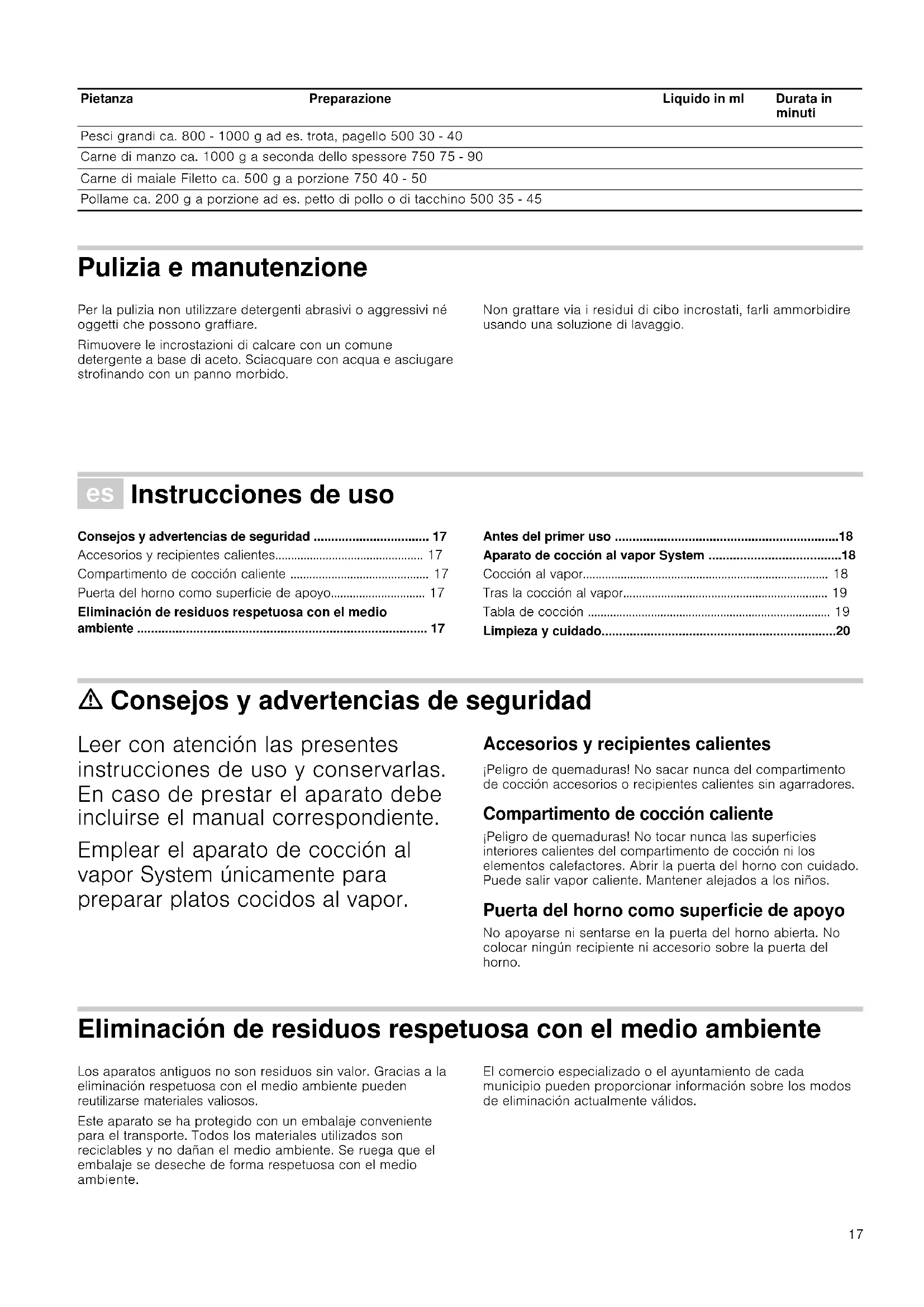 - Limpieza y cuidado ã=Consejos y advertencias de seguridad Leer con atención las presentes instrucciones de uso y conservarlas. En caso de prestar el aparato debe incluirse el manual correspondiente. Emplear el aparato de cocción al vapor System únicamente para preparar platos cocidos al vapor. Accesorios y recipientes calientes ¡Peligro de quemaduras! No sacar nunca del compartimento de cocción accesorios o recipientes calientes sin agarradores. Compartimento de cocción caliente ¡Peligro de quemaduras! No tocar nunca las superficies interiores calientes del compartimento de cocción ni los elementos calefactores. Abrir la puerta del horno con cuidado. Puede salir vapor caliente. Mantener alejados a los niños. Puerta del horno como superficie de apoyo No apoyarse ni sentarse en la puerta del horno abierta. No colocar ningún recipiente ni accesorio sobre la puerta del horno. Eliminación de residuos respetuosa con el medio ambiente Los aparatos antiguos no son residuos sin valor. Gracias a la eliminación respetuosa con el medio ambiente pueden reutilizarse materiales valiosos. Este aparato se ha protegido con un embalaje conveniente para el transporte. Todos los materiales utilizados son reciclables y no dañan el medio ambiente. Se ruega que el embalaje se deseche de forma respetuosa con el medio ambiente. El comercio especializado o el ayuntamiento de cada municipio pueden proporcionar información sobre los modos de eliminación actualmente válidos. Pesci grandi ca. 800 - 1000 g ad es. trota, pagello 500 30 - 40 Carne di manzo ca. 1000 g a seconda dello spessore 750 75 - 90 Carne di maiale Filetto ca. 500 g a porzione 750 40 - 50 Pollame ca. 200 g a porzione ad es. petto di pollo o di tacchino 500 35 - 45 Pietanza Preparazione Liquido in ml Durata in minuti18 Antes del primer uso Si el aparato de cocción al vapor System está dañado, no debe ponerse en servicio. Limpiar el aparato de cocción al vapor System y todos sus accesorios con agua caliente con jabón. Pegar la lámina protectora adjunta debajo del saliente de la encimera. Para ello, retirar la lámina, pegar y cortar a la medida. Aparato de cocción al vapor System La base del aparato de cocción al vapor System la constituyen siempre el molde de gratinado, la bandeja grande de cocción al vapor y la cubierta de vidrio. Para cantidades más grandes y para la preparación de arroz o salsas se puede utilizar además el armazón con las otras bandejas. Emplear solo las piezas originales suministradas. El folleto adjunto contiene más información sobre el método de cocción al vapor. El molde de gratinado puede utilizarse también de forma individual, p. ej., para preparar platos grandes gratinados. Cocción al vapor No abrir el horno durante el proceso de cocción. Excepción: al combinar diferentes alimentos para cocer con diferencias notables en los tiempos de cocción. El tiempo de cocción queda determinado por el tamaño del alimento que se va a cocer. Al cocer simultáneamente alimentos con tiempos de cocción diferente: ■ cortar los alimentos que requieren más tiempo en trozos más pequeños ■ cortar trozos más grandes y prolongar el tiempo de cocción para alimentos delicados En principio, para la cocción al vapor se necesitan 500 ml de agua (no destilada). Excepción: los alimentos que tienden a esponjarse (p. ej. patatas) e ingredientes con tiempos de cocción prolongados requieren 750 ml de agua (véase la tabla de cocción o el folleto adjunto). p. 20