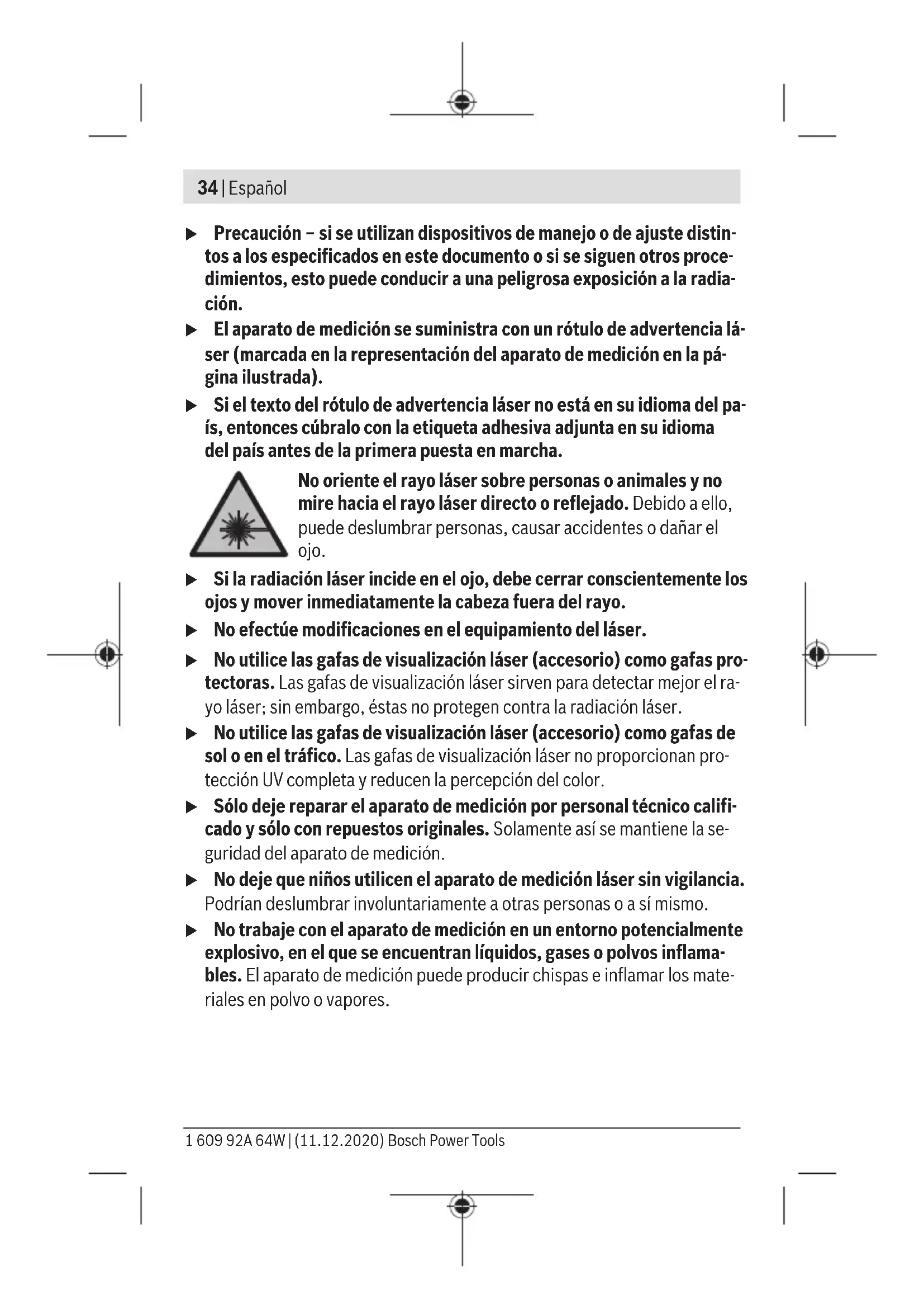 con 20–25°C C) Los valores indicados asumen condiciones ambientales normales a favorables (p. ej. sin vibraciones, sin niebla, sin humo, sin luz solar directa). Tras fuertes fluctua- ción de temperatura pueden generarse desviaciones de precisión. D) Sólo se produce un ensuciamiento no conductor, sin embargo ocasionalmente se espera una conductividad temporal causada por la condensación. Para la identificación unívoca de su aparato de medición sirve el número de referencia (11) en la placa de características. Montaje Colocar/cambiar las pilas Para el funcionamiento de la herramienta de medición se recomiendan pilas alcalinas de manganeso. Para abrir la tapa del compartimiento de pilas (9) presione la retención (12) en sentido de la flecha y quite la tapa del compartimiento de pilas. Inserte las pilas que se adjuntan. Observe en ello la polaridad correcta conforme a la representación en el la- do interior del compartimiento de pilas. Al descargarse las pilas, las líneas láser parpadean por unos segundos con un ciclo rápido. Reemplace siempre simultáneamente todas las pilas. Utilice sólo pilas de un fabricante y con igual capacidad. u Retire las pilas del aparato de medición, si no va a utilizarlo durante un periodo largo. Si las pilas se almacena durante mucho tiempo en el aparato de medición, pueden corroerse y autodescargarse. Operación Puesta en marcha u Proteja el aparato de medición de la humedad y de la exposición di- recta al sol. Bosch Power Tools 1 609 92A 64W | (11.12.2020)38 | Español u No exponga el aparato de medición a temperaturas extremas o fluc- tuaciones de temperatura. No la deje, por ejemplo, durante un tiempo prolongado en el automóvil. En caso de fuertes fluctuaciones de tempera- tura, deje que se estabilice primero la temperatura de la herramienta de medición antes de la puesta en servicio. Las temperaturas extremas o los cambios bruscos de temperatura pueden afectar a la exactitud del apara- to de medición. u Evite que el aparato de medición reciba golpes o que caiga. Los daños en la herramienta de medición pueden afectar a la precisión de los resul- tados. Después de un impacto violento o caída, compare la línea del láser con una línea de referencia horizontal o vertical conocida para su control. u Desconecte el aparato de medición cuando vaya a transportarlo. Al desconectarlo, la unidad del péndulo se inmoviliza, evitándose así que se dañe al quedar sometida a una fuerte agitación. Conexión/desconexión Para conectar el aparato de medición, desplace el interruptor de conexión/ desconexión (4) hacia arriba. Inmediatamente después de la conexión, el aparato de medición proyecta dos líneas láser desde las aberturas de salida (5). Para desconectar el aparato de medición, empuje el interruptor de cone- xión/desconexión(4) hacia abajo sobre la abertura de salida(5). u No deje sin vigilancia el aparato de medición encendido y apague el aparato de medición después del uso. El rayo láser podría deslumbrar a otras personas. Nivelación automática Coloque el aparato de medición sobre una superficie horizontal y sólida, fíje- lo al soporte(16) o al trípode(6). Para trabajar con la nivelación automáti- ca, la parte inferior del aparato de medición debe estar horizontal y con el alojamiento del trípode(8) orientado hacia abajo. Tras la conexión, la nive- lación automática compensa automáticamente los desniveles dentro del margen de autonivelación de ±4°. La nivelación se ha finalizado, una vez que ya no parpadeen las líneas láser. Si no es posible trabajar con nivelación automática, p. ej. debido a que el la- do inferior del aparato de medición diverge más de4° de la horizontal o el aparato de medición se sujeta libremente en la mano, entonces parpadean permanentemente las líneas láser con un ciclo lento y el aparato de medición 1 609 92A 64W | (11.12.2020) Bosch Power ToolsEspañol | 39 trabaja sin nivelación automática. Las líneas láser permanecen conectadas, no obstante, las dos líneas en cruz ya no están obligatoriamente en ángulo recto entre sí. Para garantizar, que las dos líneas láser sigan en ángulo recto entre sí, posicione el aparato de medición ortogonalmente con respecto a la pared. En el caso de vibraciones o modificaciones de posición durante el servicio, el aparato de medición se nivela de nuevo automáticamente. Tras una nueva nivelación, verifique la posición de la línea láser horizontal o vertical en cuanto a los puntos de referencia, para evitar errores debido a un desplaza- miento del aparato de medición. Instrucciones para la operación u Utilice siempre sólo el centro de la línea láser para marcar. El ancho de la línea de láser cambia con la distancia. Fijación con el soporte (verfiguraA) Con la ayuda del soporte(16) puede fijar el aparato de medición a varios ob- jetos con un espesor de 10 hasta 60mm, p. ej. en tablas o tubos verticales o horizontales. Suelte el tornillo de fijación(15) del soporte, coloque el soporte en el lugar deseado y apriete de nuevo el tornillo de fijación. Coloque el aparato de medición con el alojamiento del trípode(8) sobre el tornillo de 1/4"(13) del soporte y apriételo con fuerza moderada en el so- porte. No apriete demasiado el aparato de medición para evitar que se dañe. Nivele el soporte de forma aproximada antes de conectar el aparato de me- dición. Para ello, suelte el tornillo de sujeción(14) del soporte. Mueva el aparato de medición a la altura deseada en una posición horizontal (con el alojamiento del trípode(8) hacia abajo). Apriete de nuevo el tornillo de fija- ción. El aparato de medición también lo puede fijar con la placa de adaptación(3) sobre el soporte. Trabajos con el trípode (accesorio) Un trípode ofrece una base de medición estable y regulable en la altura. Co- loque el aparato de medición con el alojamiento del trípode de 1/4" (8) so- bre la rosca del trípode (6) o de un