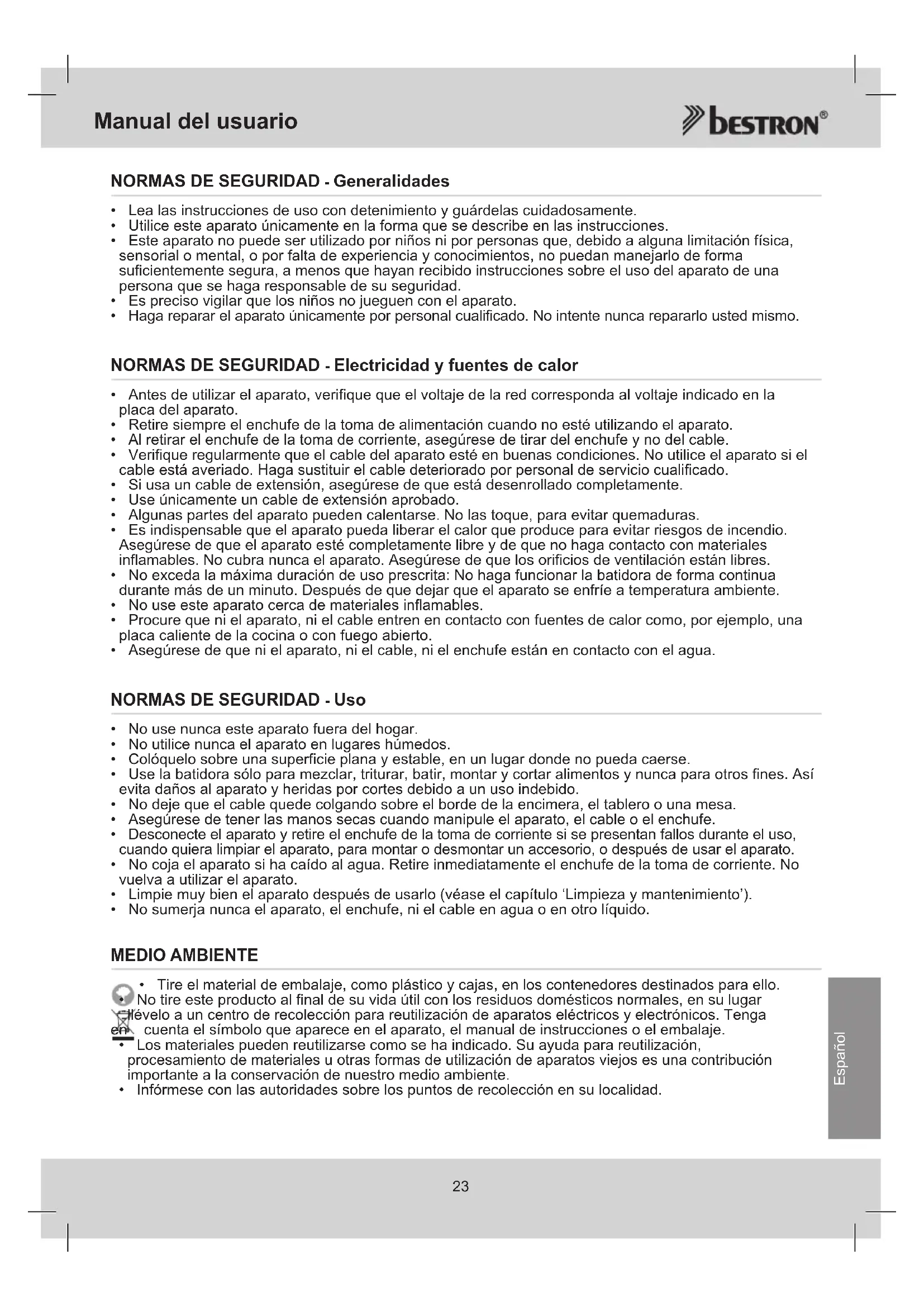 - No sumerja nunca el aparato, el enchufe, ni el cable en agua o en otro líquido. MEDIO AMBIENTE