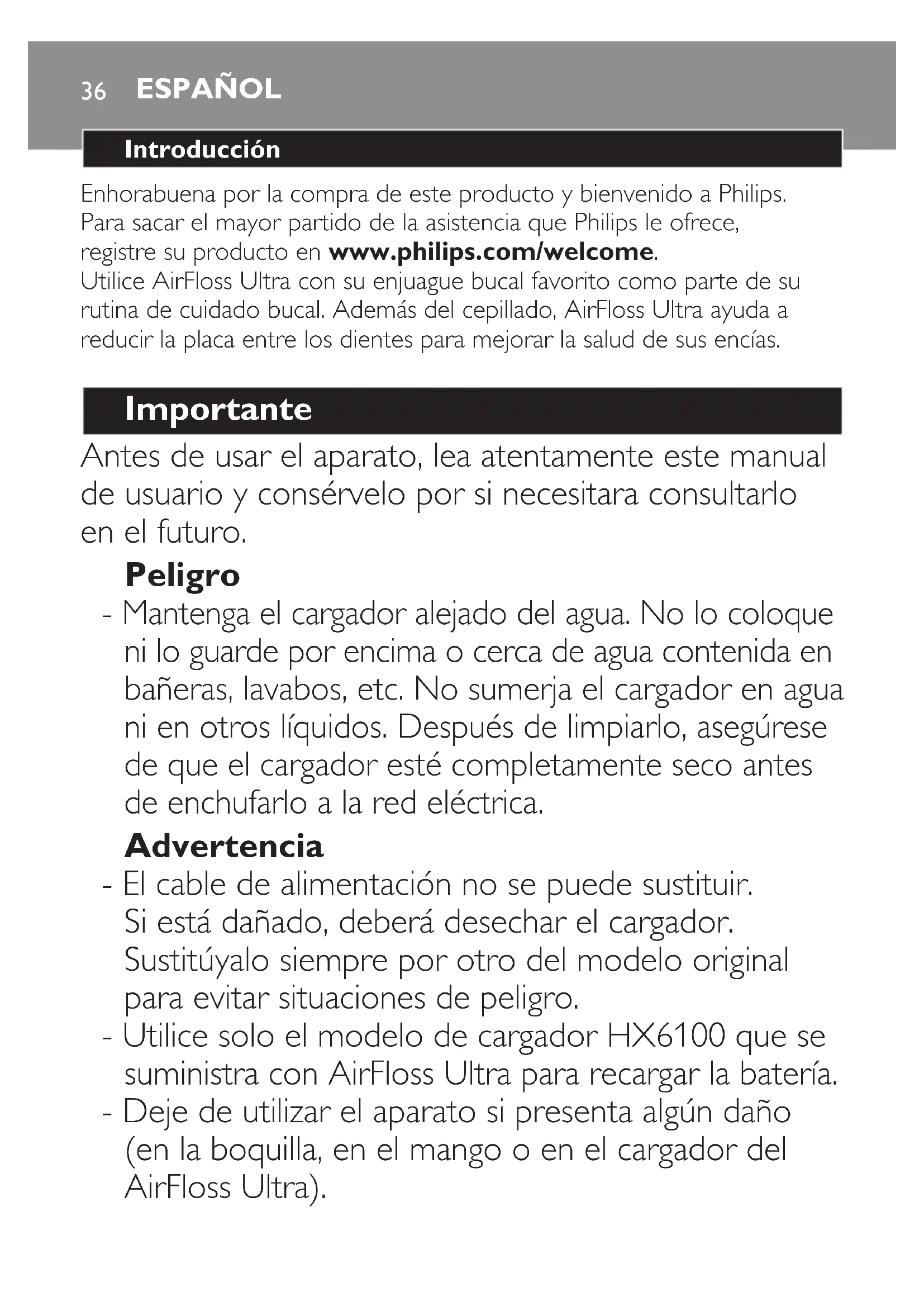 Advertencia - El cable de alimentación no se puede sustituir. Si está dañado, deberá desechar el cargador. Sustitúyalo siempre por otro del modelo original para evitar situaciones de peligro. - Utilice solo el modelo de cargador HX6100 que se suministra con AirFloss Ultra para recargar la batería. - Deje de utilizar el aparato si presenta algún daño (en la boquilla, en el mango o en el cargador del AirFloss Ultra). ESPAÑOL- Este aparato contiene piezas que no son reemplazables. Si el aparato está dañado, póngase en contacto con el servicio de atención al cliente en su país (consulte el capítulo “Garantía y asistencia”). - No utilice el cargador al aire libre ni cerca de supercies calientes. - Este aparato puede ser usado por niños mayores de ocho años, por personas con capacidad física, psíquica o sensorial reducida y por personas que no tengan los conocimientos y la experiencia necesarios, siempre que hayan recibido la supervisión adecuada o instruidos acerca del uso del aparato de forma segura y siempre que sepan los riesgos que conlleva su uso. No permita que los niños jueguen con el aparato. Los niños no deben llevar a cabo los procesos de limpieza ni de mantenimiento a menos que tengan más de ocho años y sean supervisados. Precaución - Antes de utilizar este producto, consulte a su dentista si se ha sometido recientemente a cirugía oral o en las encías, si padece alguna enfermedad dental, si se ha sometido a intervenciones dentales en los dos (2) meses anteriores, o si sospecha que tiene algún problema con los trabajos dentales que le han practicado (empastes, coronas, etc.). - Consulte a su dentista si se produce un sangrado excesivo después de usar este aparato, o si el sangrado continúa produciéndose después de 4 semanas de uso. ESPAÑOL 37- Si tiene alguna duda médica, consulte a su médico antes de utilizar este aparato. - Este aparato de Philips cumple con las normas de seguridad para dispositivos electromagnéticos. Si tiene un marcapasos u otro dispositivo implantado, consulte a su médico o al fabricante de dichos dispositivos antes de utilizar el aparato. - No utilice otros accesorios que no sean los recomendados por el fabricante. - No aplique una presión excesiva en la punta de la boquilla. - Para evitar lesiones físicas, no llene el depósito con agua caliente. No introduzca objetos extraños en el depósito. - Utilice el AirFloss Ultra solo para el uso al que está destinado, tal y como se describe en este manual de usuario. - Para evitar lesiones físicas, no dirija el pulverizador debajo de la lengua ni en la oreja, la nariz, los ojos u otras zonas sensibles. - No lave la boquilla del AirFloss Ultra, el mango, el cargador, el depósito de agua ni su cubierta en el lavavajillas. No introduzca estas piezas en el microondas. - Para evitar riesgos de ingestión, no ponga alcohol isopropílico ni otros líquidos de limpieza en el depósito. - El AirFloss Ultra es un dispositivo de higiene personal y no se ha diseñado para su uso en varios pacientes en clínicas o instituciones dentales. ESPAÑOL38Campos electromagnéticos (CEM) Este aparato de Philips cumple los estándares y las normativas aplicables sobre exposición a campos electromagnéticos. Descripción general (g. 1) 1 Punta de la boquilla 2 Boquilla de AirFloss Ultra 3 Botón de activación 4 Depósito y cubierta del depósito 5 Mango 6 Indicadores de carga y modo de ráfaga - Una sola ráfaga: 1 LED - Doble ráfaga: 2 LED - Triple ráfaga: 3 LED 7 Botón de encendido/modo 8 Soporte de la boquilla extraíble (en algunos modelos) 9 Cargador Nota: El contenido de la caja puede variar en función del modelo que adquiera. Carga Cargue el AirFloss Ultra durante 24 horas antes de utilizar el producto por primera vez. 1 Enchufe la clavija del cargador a la toma de corriente. 2 Coloque el mango en el cargador (g. 2). , Proceso de carga: (g. 3) - 1 piloto LED verde: 33 % de carga - 2 pilotos LED verdes: 66 % de carga - 3 pilotos LED verdes: 100 % de carga Nota: Cuando está totalmente cargado, el AirFloss Ultra ofrece un tiempo de funcionamiento de hasta 11 días cuando se utiliza en modo de triple ráfaga y de hasta 33 días cuando se utiliza en modo de una sola ráfaga. Nota: Si el indicador de carga parpadea en amarillo, la batería se está agotando y debe recargarse (quedan menos de 3 usos). ESPAÑOL 39Preparación para su uso 1 Alinee la boquilla y presione hacia abajo para que encaje en el mango (escuchará un “clic”) (g. 4). Nota: Le aconsejamos que coloque la punta mirando hacia la parte frontal del mango, como se muestra en la ilustración. Sin embargo, la boquilla se puede colocar en el mango en cualquier posición sin que esto afecte a su funcionamiento. Puede probar ambas opciones y utilizar la que le resulte más cómoda en su rutina de cuidado bucal. Nota: Sustituya la boquilla cada seis meses (HX8032, HX8033) para obtener unos resultados óptimos. Sustituya también la boquilla si se aoja o si ya no hace “clic” al colocarse en el mango. Nota: AirFloss Ultra solo admite las boquillas de AirFloss Ultra. No intente utilizar boquillas que no sean AirFloss Ultra en el mango AirFloss Ultra. 2 Abra la cubierta del depósito (“clic”) (g. 5). 3 Llene el depósito con enjuague bucal o agua (g. 6). Consejo: Para obtener los mejores resultados y una experiencia más fresca, le recomendamos que utilice enjuague bucal con el AirFloss Ultra. Nota: No utilice enjuagues bucales que contengan miristato de isopropilo (por ejemplo, Dentyl Active) o una alta concentración de aceites esenciales, ya que podrían dañar el producto. Esto incluye todos los enjuagues bucales que se venden en botes de cristal o de cerámica. 4 Cierre la cubierta del depósito presionándolo (“clic”) (g. 7). 5 Pulse brevemente el botón de encendido/modo para encender el aparato. (g. 8) , Los pilotos LED se iluminan. 6 Mantenga pulsado el botón de activación hasta que la punta de la boquilla