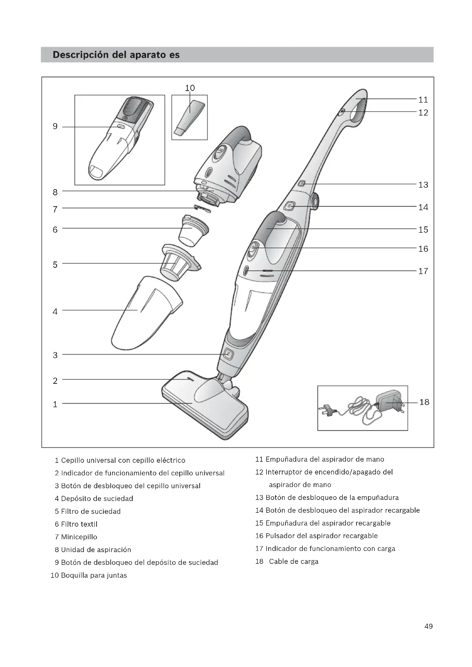 1 Cepillo universal con cepillo eléctrico 2 Indicador de funcionamiento del cepillo universal 3 Botón de desbloqueo del cepillo universal 4 Depósito de suciedad 5 Filtro de suciedad 6 Filtro textil 7 Minicepillo 8 Unidad de aspiración 9 Botón de desbloqueo del depósito de suciedad 10 Boquilla para juntas 11 Empuñadura del aspirador de mano 12 Interruptor de encendido/apagado del aspirador de mano 13 Botón de desbloqueo de la empuñadura 14 Botón de desbloqueo del aspirador recargable 15 Empuñadura del aspirador recargable 16 Pulsador del aspirador recargable 17 Indicador de funcionamiento con carga 18 Estación de carga 19 Soporte base para la estación de carga 20 Cable de carga Cable de carga Descripción del aparato es50