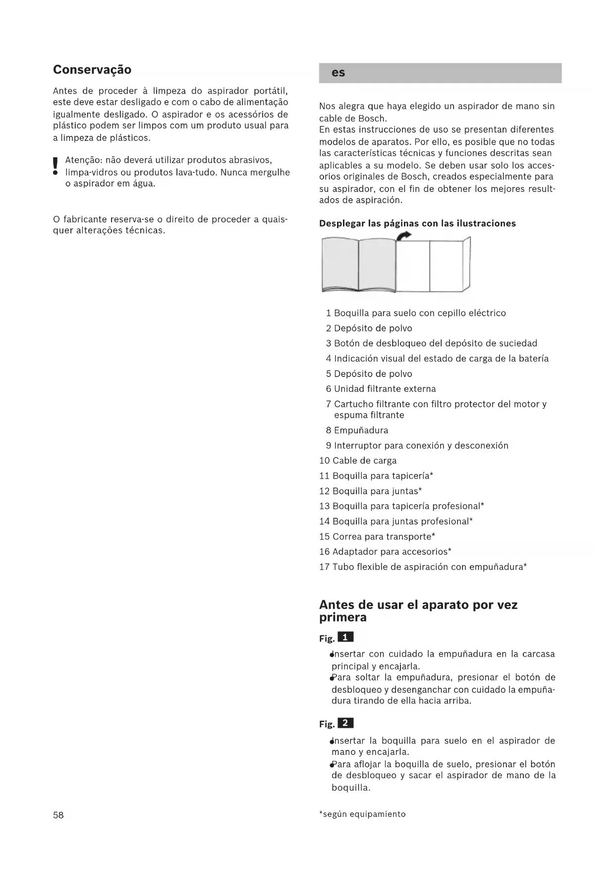 Nos alegra que haya elegido un aspirador de mano sin cable de Bosch. En estas instrucciones de uso se presentan diferentes modelos de aparatos. Por ello, es posible que no todas las características técnicas y funciones descritas sean aplicables a su modelo. Se deben usar solo los acces- orios originales de Bosch, creados especialmente para su aspirador, con el fin de obtener los mejores result- ados de aspiración. Desplegar las páginas con las ilustraciones 1 Boquilla para suelo con cepillo eléctrico 2 Depósito de polvo 3 Botón de desbloqueo del depósito de suciedad 4 Indicación visual del estado de carga de la batería 5 Depósito de polvo 6 Unidad filtrante externa 7 Cartucho filtrante con filtro protector del motor y espuma filtrante 8 Empuñadura 9 Interruptor para conexión y desconexión 10 Cable de carga 11 Boquilla para tapicería* 12 Boquilla para juntas* 13 Boquilla para tapicería profesional* 14 Boquilla para juntas profesional* 15 Correa para transporte* 16 Adaptador para accesorios* 17 Tubo flexible de aspiración con empuñadura* Antes de usar el aparato por vez primera Fig.