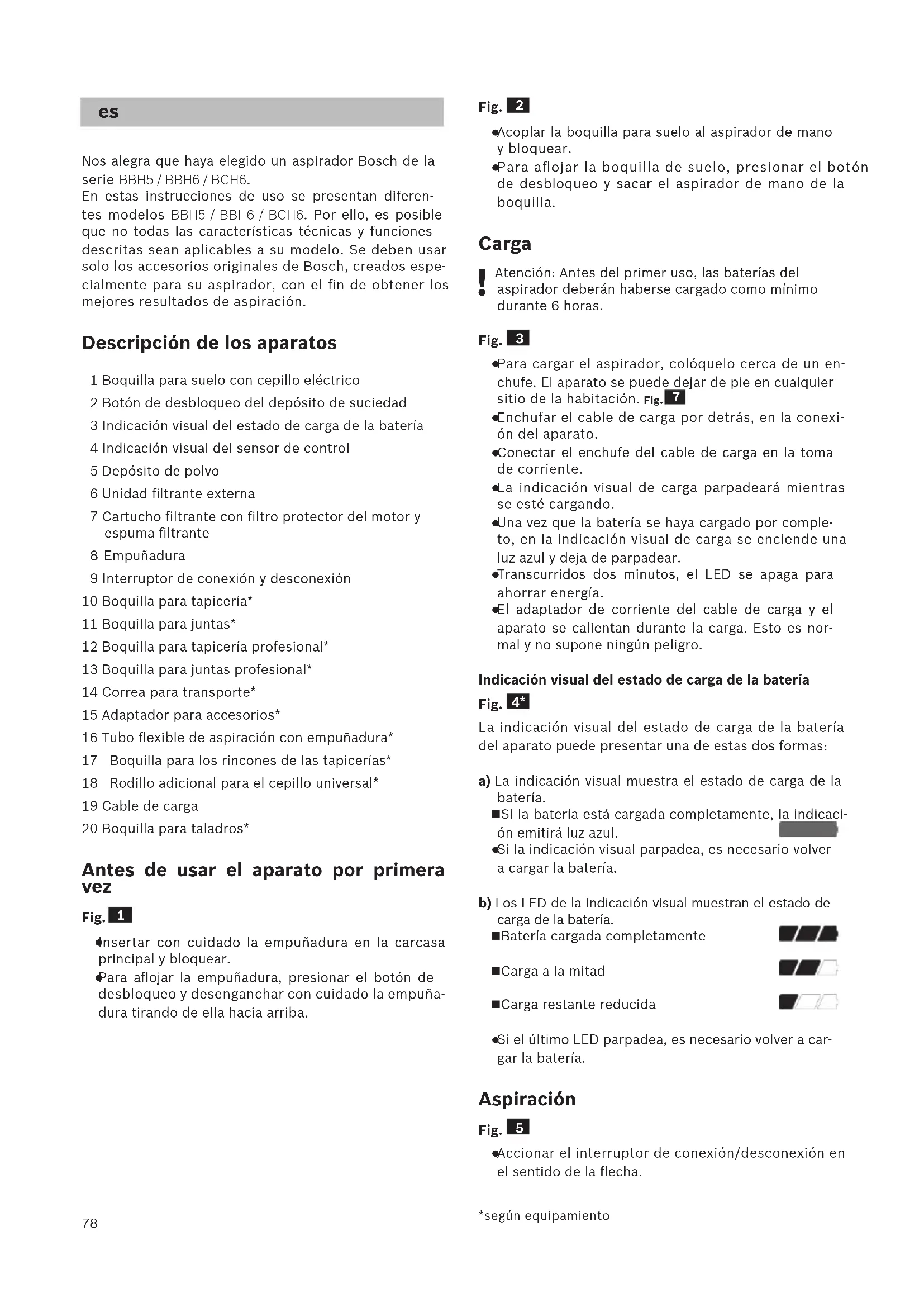 Nos alegra que haya elegido un aspirador Bosch de la serie BBH5 / BBH6 / BCH6. En estas instrucciones de uso se presentan diferen- tes modelos BBH5 / BBH6 / BCH6. Por ello, es posible que no todas las características técnicas y funciones descritas sean aplicables a su modelo. Se deben usar solo los accesorios originales de Bosch, creados espe- cialmente para su aspirador, con el fin de obtener los mejores resultados de aspiración. Descripción de los aparatos 1 Boquilla para suelo con cepillo eléctrico 2 Botón de desbloqueo del depósito de suciedad 3 Indicación visual del estado de carga de la batería 4 Indicación visual del sensor de control 5 Depósito de polvo 6 Unidad filtrante externa 7 Cartucho filtrante con filtro protector del motor y espuma filtrante 8 Empuñadura 9 Interruptor de conexión y desconexión 10 Boquilla para tapicería* 11 Boquilla para juntas* 12 Boquilla para tapicería profesional* 13 Boquilla para juntas profesional* 14 Correa para transporte* 15 Adaptador para accesorios* 16 Tubo flexible de aspiración con empuñadura* 17 Boquilla para los rincones de las tapicerías* 18 Rodillo adicional para el cepillo universal* 19 Cable de carga 20 Boquilla para taladros* Antes de usar el aparato por primera vez Fig.