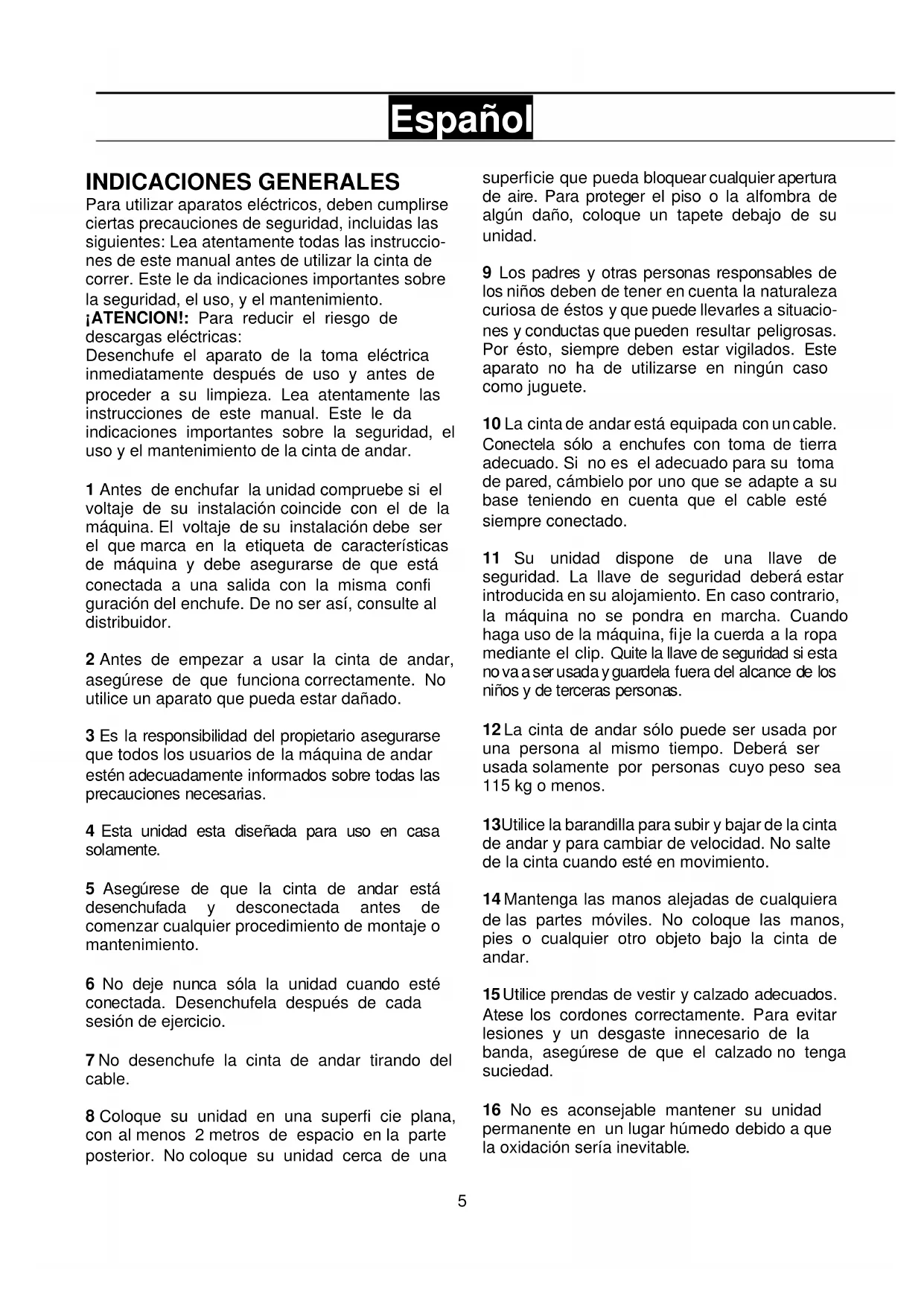 Para utiliser aparatos electricos, deben裱pirse ciertas precauciones de seguridad, incluidas las siguientes: Lea atentamente todas las instrucciones de este manual antes de usar la cinta de correr. Este le da indications importantes sobre lacurity, el uso, y el mantenimiento.