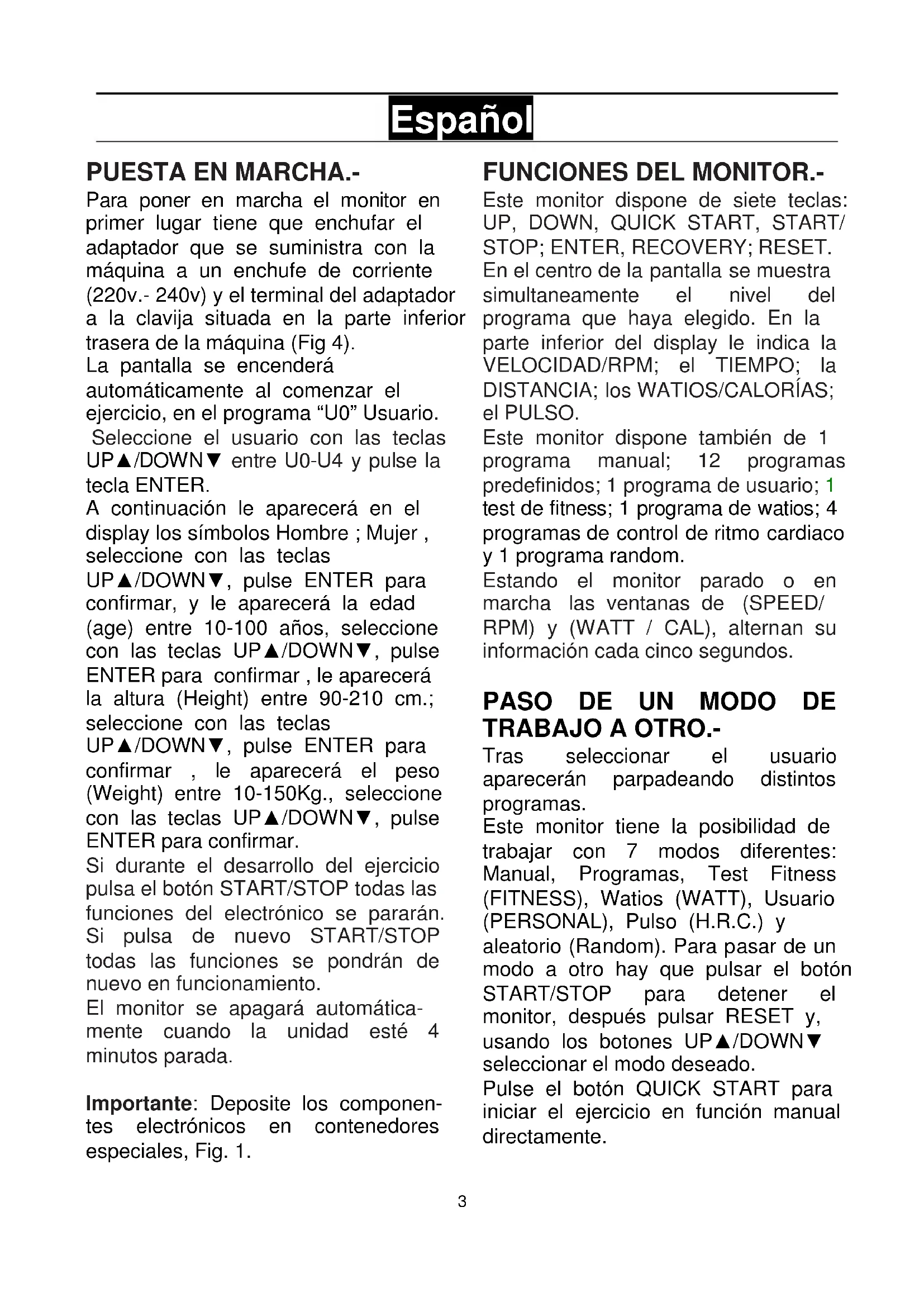 Este monitor dispone de siete teclas: UP, DOWN, QUICK START, START/STOP; ENTER, RECOVERY; RESET. En el centro de la pantalla se muestra simultaneamente el nivel del programa que haya elegido. En la parte inferior del display le indica la VELOCIDAD/RPM; el TIEMPO; la DISTANCIA; los WATIOS/CALORÍAS; el PULSO.