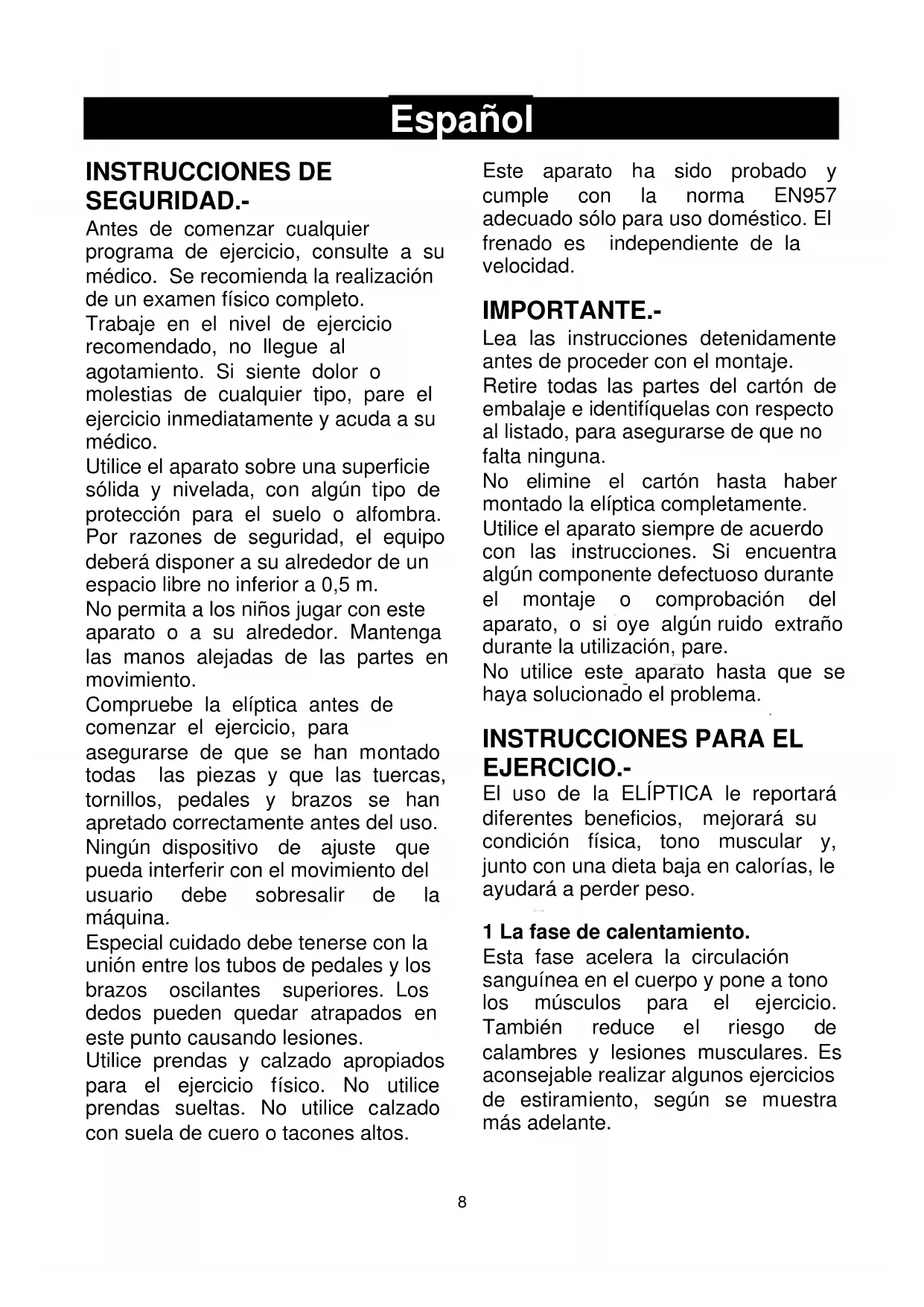 Este aparato ha sido probado y cumple con la norma EN957 adequado solo para uso dométrico. El frenado es independiente de la velocidad.