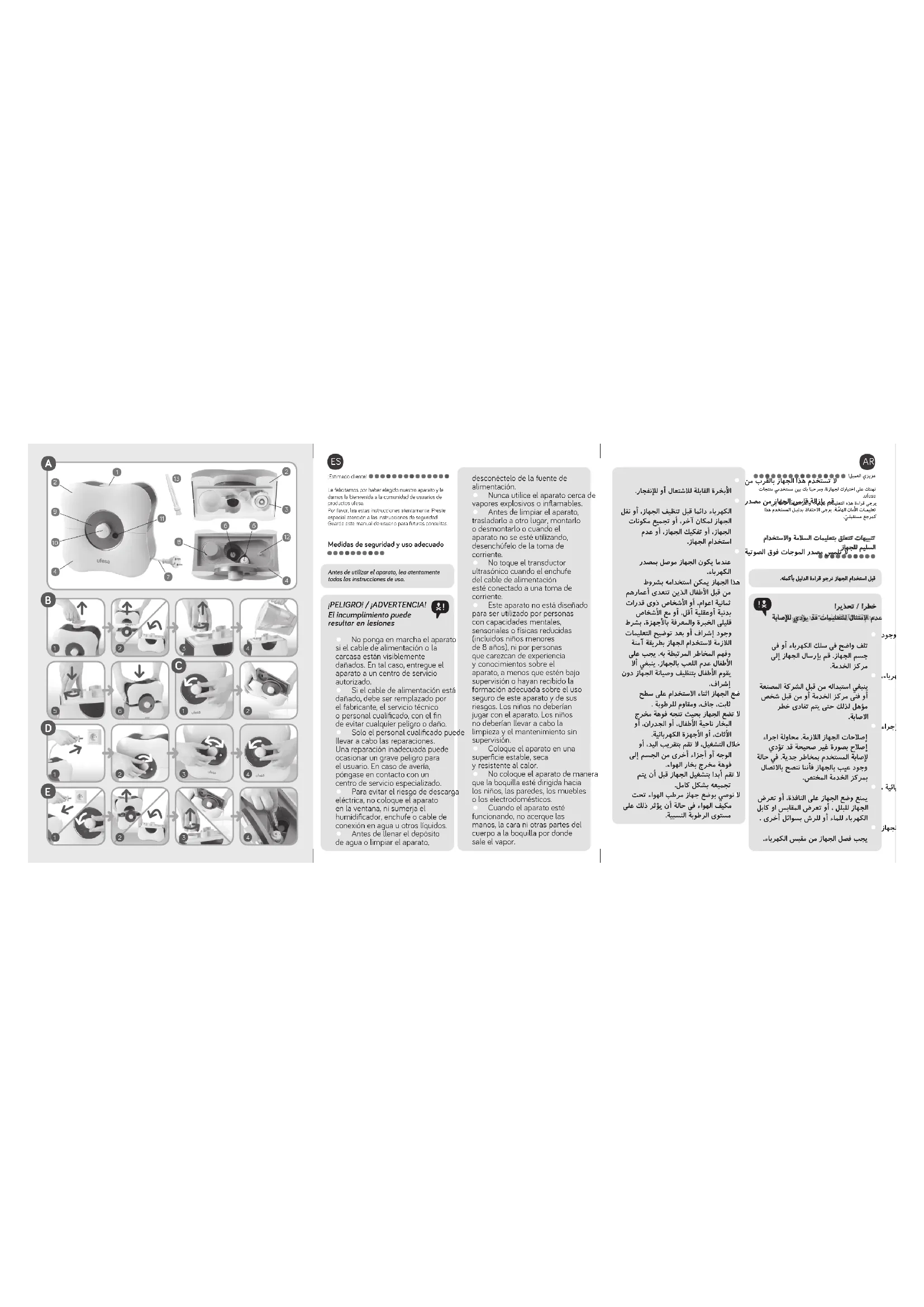 Nosumerja la base del humidificador en agua. No lave el aparato con agua corriente. Tenga cuidado de que el agua no entrel al interior del aparato, ya que puede danar sus piezas internas. Noutilice detergentes abrasivos como emulsiones, geles, pastas,etc. para limpiar el aparato, ya que pueda eliminar los SYMBOLos graficos de informacion, tales como marcaciones, senales de advertencia, etc.