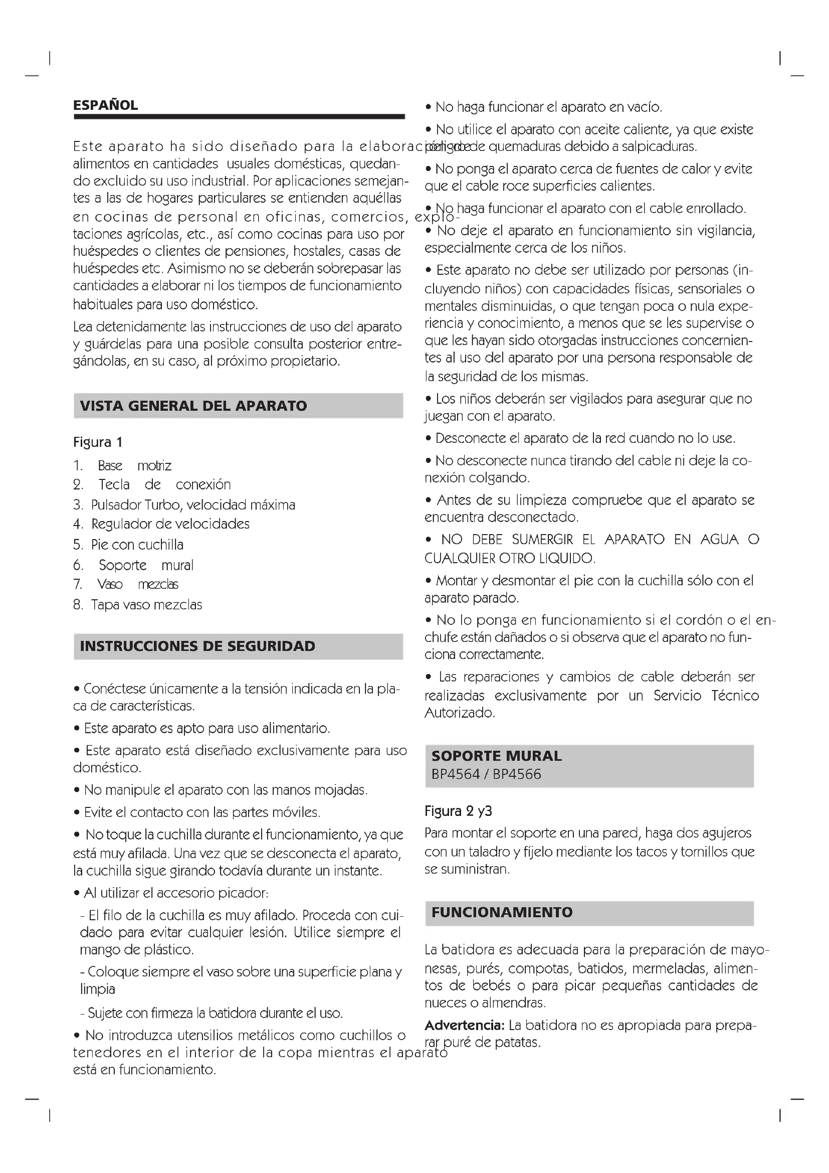 - Las reparaciones y cambios de cable deberán ser realizadas exclusivamente por un Servicio Técnico Autorizado. SOPORTE MURAL BP4564 / BP4566 Figura 2 y3 Para montar el soporte en una pared, haga dos agujeros con un taladro y fíjelo mediante los tacos y tornillos que se suministran. FUNCIONAMIENTO La batidora es adecuada para la preparación de mayo- nesas, purés, compotas, batidos, mermeladas, alimen- tos de bebés o para picar pequeñas cantidades de nueces o almendras. Advertencia: La batidora no es apropiada para prepa- rar puré de patatas.• Encajar el pie 5 en la base motriz de la batidora 1 y gritarlo hacia la izquierda (sentida de marcha contrario al de las agujas del reloj) (fig. 4)