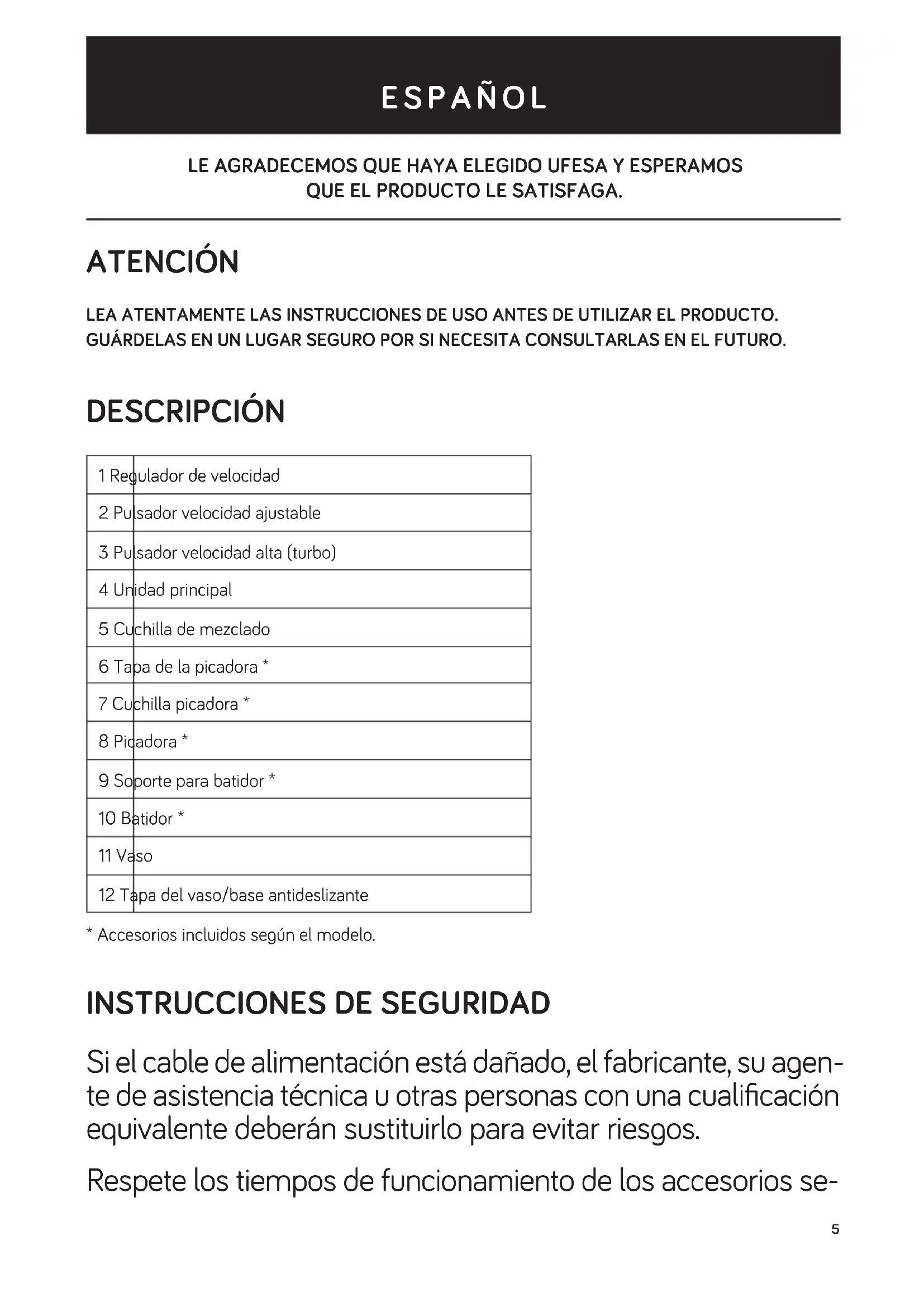 FIG. 95 LE AGRADECEMOS QUE HAYA ELEGIDO UFESA Y ESPERAMOS QUE EL PRODUCTO LE SATISFAGA. ATENCIÓN LEA ATENTAMENTE LAS INSTRUCCIONES DE USO ANTES DE UTILIZAR EL PRODUCTO. GUÁRDELAS EN UN LUGAR SEGURO POR SI NECESITA CONSULTARLAS EN EL FUTURO. DESCRIPCIÓN 1 Regulador de velocidad 2 Pulsador velocidad ajustable 3 Pulsador velocidad alta (turbo) 4 Unidad principal 5 Cuchilla de mezclado 6 Tapa de la picadora * 7 Cuchilla picadora * 8 Picadora * 9 Soporte para batidor * 10 Batidor * 11 Vaso 12 Tapa del vaso/base antideslizante