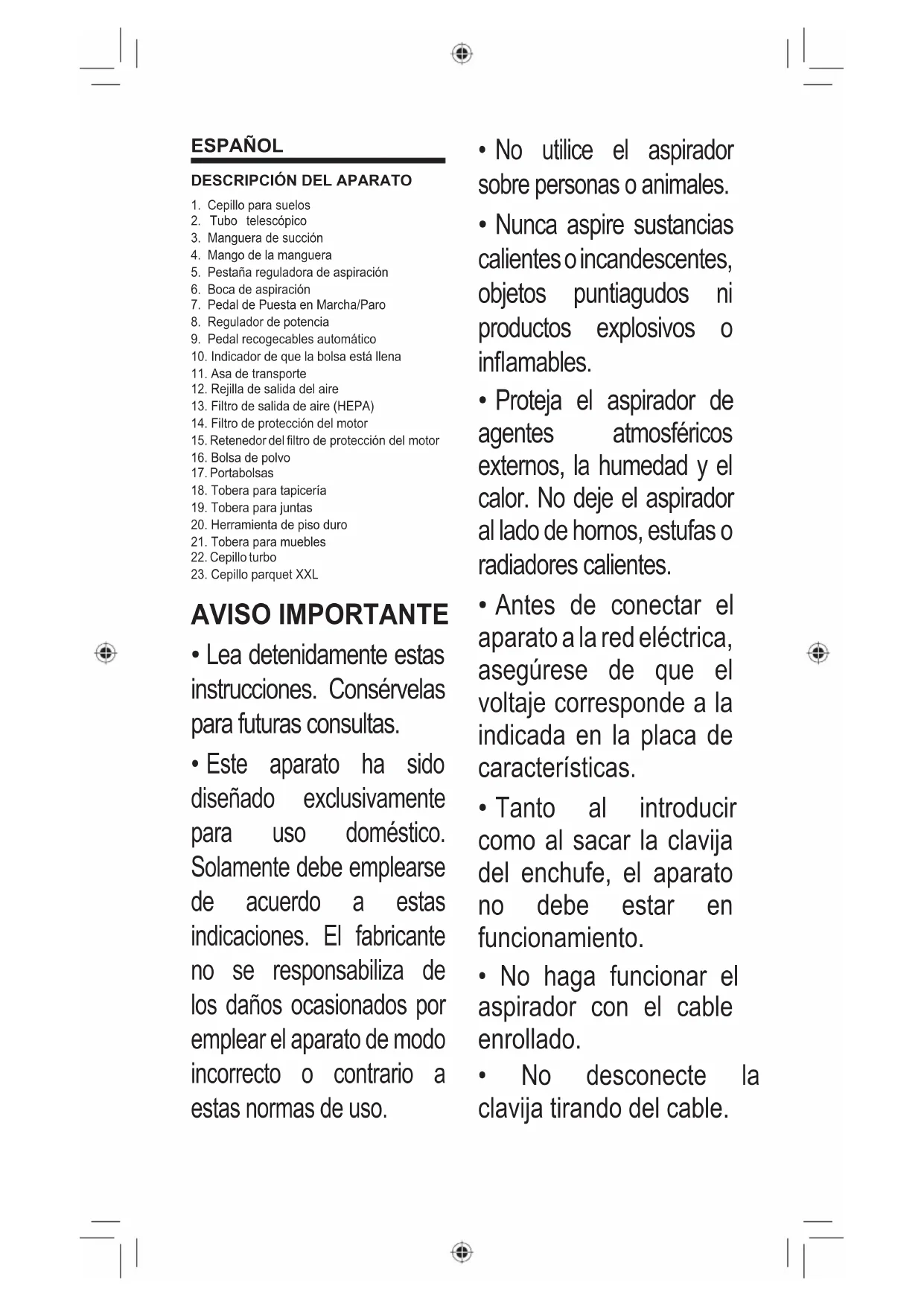 - No desconecte la clavija tirando del cable.• Desenchufe el aspirador de la red cuando no se use y antes de proceder a su limpieza o cambiar las bolsas o filtros.