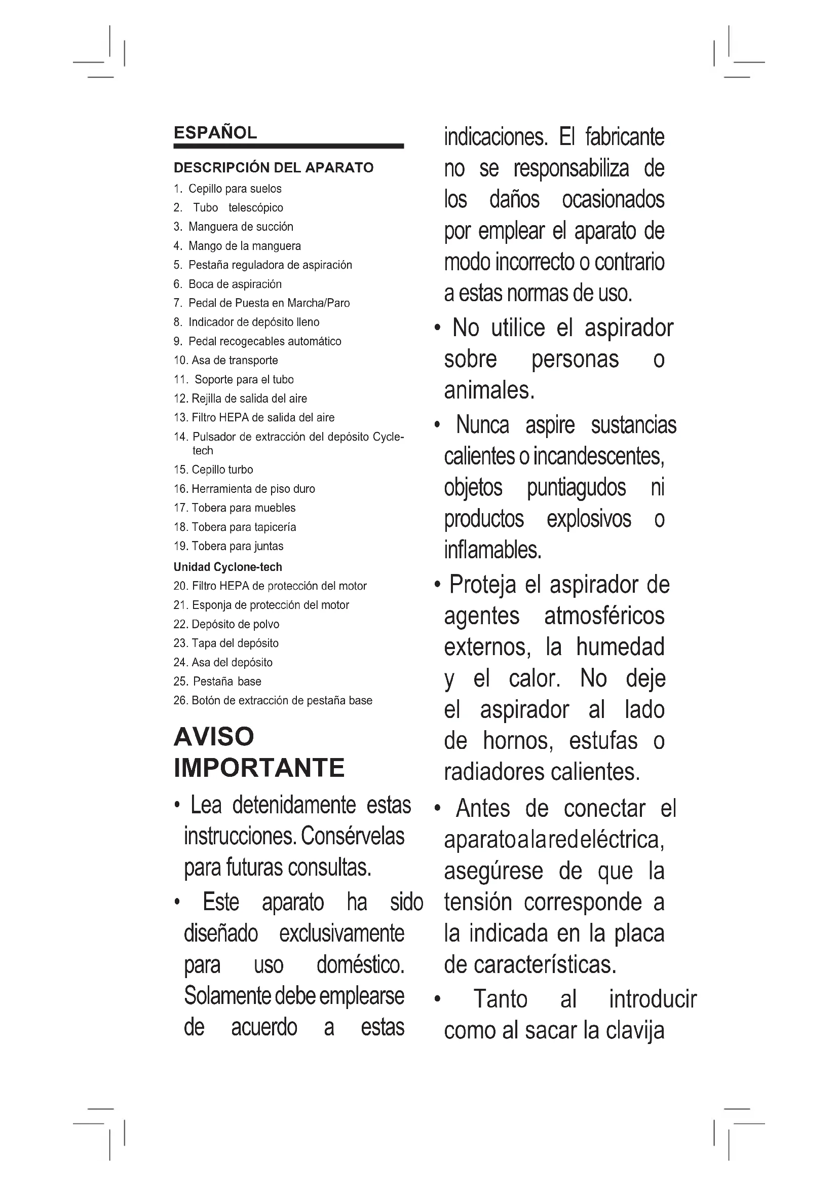 MASCOTAS Y ALFOMBRAS (15) El cepillo ha sido diseñado especialmente para limpiar tapetes y alfombras. El cepillo de rotación vibra suavemente en contra de las fibras de la alfombra para lograr una limpieza más profunda. ACCESORIOS Herramienta de piso duro (16) Esta herramienta se ha diseñado especialmente para limpiar superficies de pisos, baldosas y terracota, las cerdas suaves cepillan la superficie recogiendo el polvo pero sin dañar el piso. Tobera para muebles (17) Este accesorio es ideal para aspirar muebles y otras superficies delicadas, evitando que se dañen. Tobera para tapicería (18) Este accesorio se ha diseñado para limpiar todos los tipos de tapicería. Tobera para juntas (19) Utilice este accesorio para aspirar juntas, ranuras y rincones profundos, etc. LIMPIEZA Desconecte el aspirador de la red antes de su limpieza. Los accesorios y el aspirador pueden limpiarse con un paño húmedo, dejándolos secar completamente antes de volver a colocarlos. Nunca debe sumergir el aparato en agua. No utilice disolventes ni productos abrasivos para su limpieza. CONSEJOS SOBRE ELIMINACIÓN: Nuestros productos se entregan en un embalaje optimizado. Consiste básicamente en materiales no contaminantes que deben entregarse al servicio local de retirada de residuos como materias primas secundarias. Este producto cumple con la Directiva 2002/96/EC de la UE. El símbolo del contenedor tachado que se coloca en el aparato indica que este producto no debe eliminarse en la corriente de residuos domésticos. Deberá entregarse en un punto de recogida especial para aparatos eléctricos y electrónicos o devolverse al distribuidor, si se va a comprar un aparato similar. Bajo las actuales regulaciones de eliminación, los usuarios que no entreguen los aparatos desechados en los puntos de recogida especiales pueden ser sancionados. La correcta eliminación de estos aparatos significa que se pueden reciclar y procesar ecológicamente, para respetar el medio ambiente y permitir la reutilización de los materiales. Para más información acerca de los programas de eliminación de recursos, póngase en contacto con su servicio local de recogida o el comercio donde haya adquirido el producto. Los fabricantes e importadores son responsables del reciclaje ecológico, procesamiento y eliminación de los productos, de forma directa o través de un sistema público. Su ayuntamiento le informará sobre las posibilidades de eliminación para los aparatos en desuso.ENGLISH